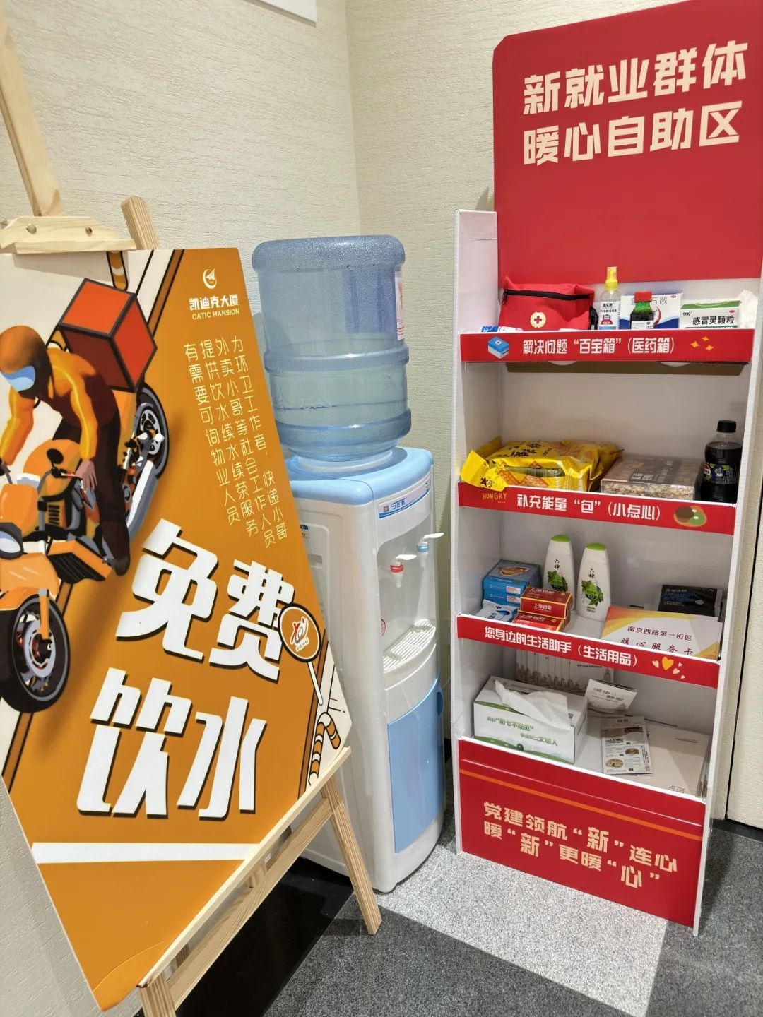 走进位于静安区江宁路的凯迪克大厦,穿过一楼电梯等候区,整洁明亮的公共空间焕然一新。如今,这里不仅是凯迪克大厦党群服务站,还焕新打造成石门二路街道南京西路第一街区党群服务站,一站式集成了为新就业群体量身定制的服务及功能。