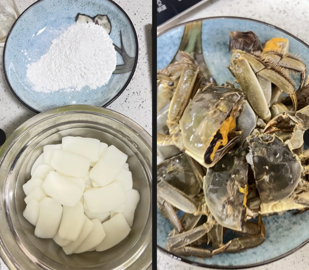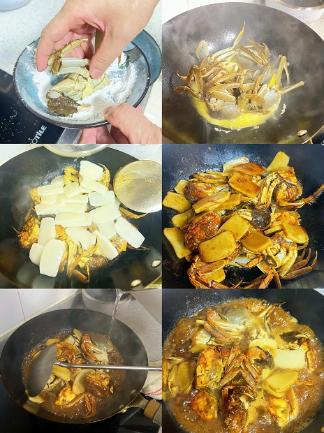 1.大闸蟹刷洗干净,对半切开,切面沾上生粉后直接下锅煎至定型。