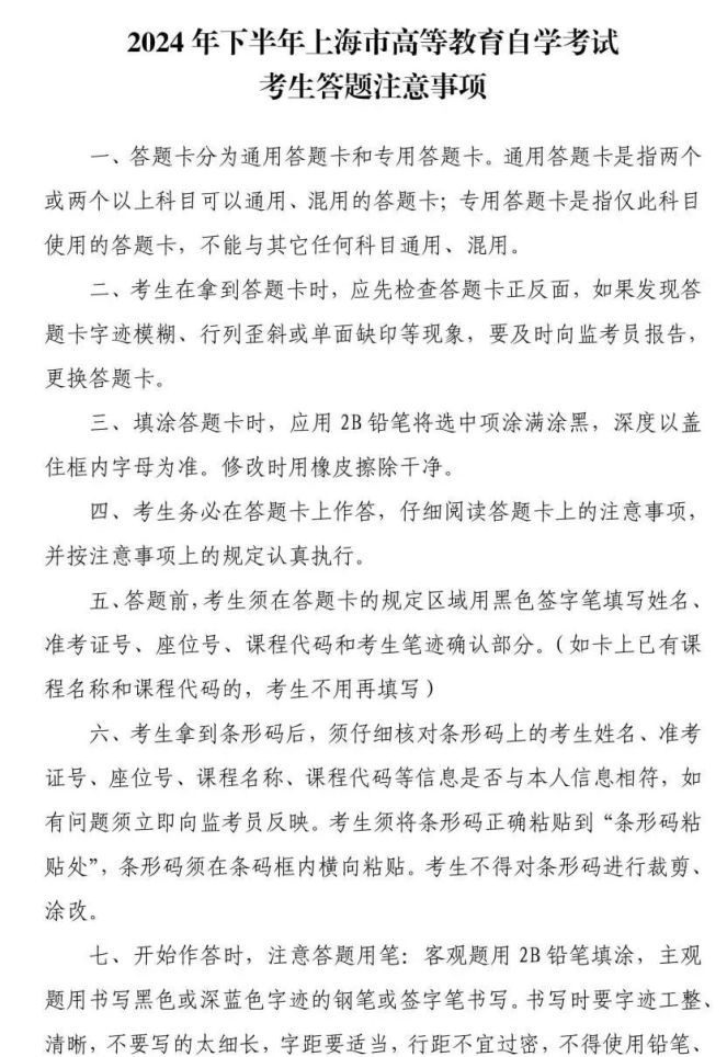 六、考生须认真阅读《2024年下半年上海市高等教育自学考试考场规则》(附文末)及《2024年下半年上海市高等教育自学考试考生答题注意事项》(附文末),了解考试相关规定和要求。