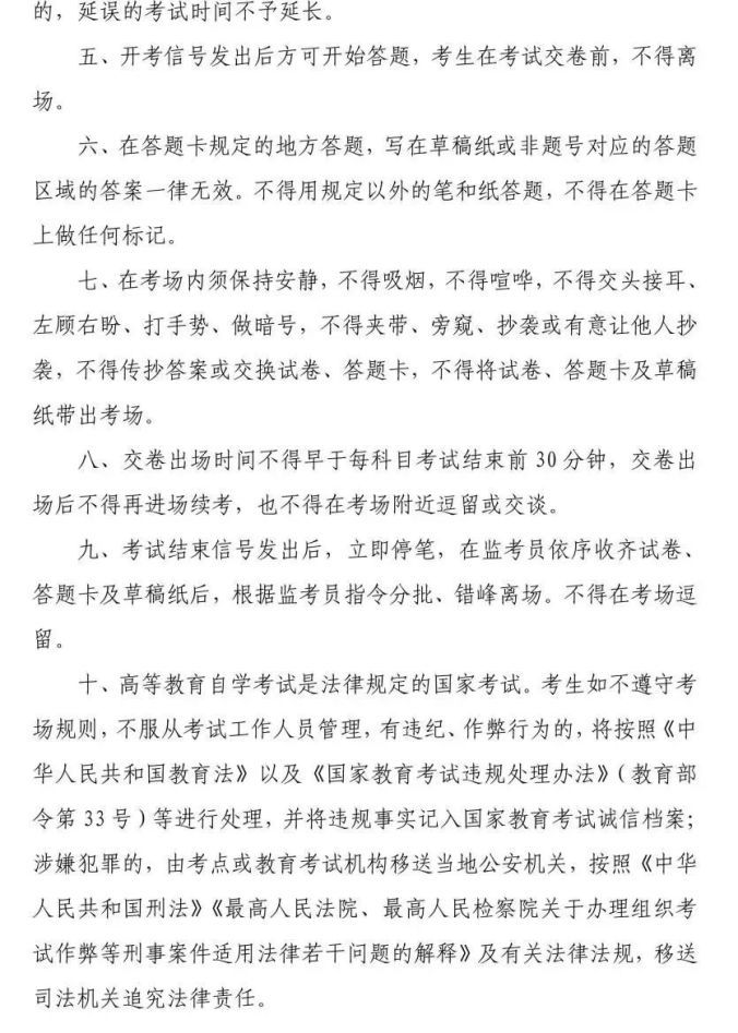 七、高等教育自学考试是法律规定的国家考试,考生须自觉遵守国家有关法律、法规和考试相关规定。根据《国家教育考试违规处理办法》,考生在考试中有违纪行为的,取消该科目的考试成绩;考生在考试中有作弊行为的,取消当次考试所有科目的考试成绩;代替他人或者让他人代替自己参加国家考试的,处拘役或者管制,并追究法律责任。考生违纪、作弊行为均将记入国家教育考试诚信档案,请务必严格遵守考试纪律,认真履行诚信考试承诺。