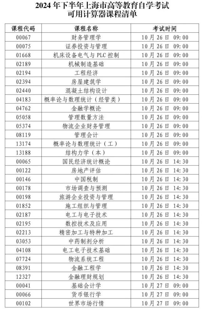 五、根据考试要求,部分课程可使用不带通讯功能、记忆存储功能、图像功能的计算器,具体课程清单见《2024年下半年上海市高等教育自学考试可用计算器课程清单》(详见下方)。