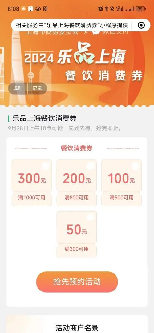 1.用户打开微信,在微信搜索框搜索“乐品上海 餐饮消费券”小程序,或扫描下方小程序二维码即可进入活动页面。