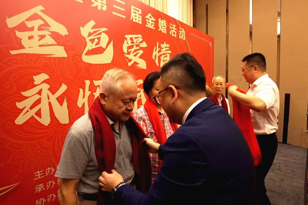携手同行五十载,相濡以沫到白头。10月18日,静安寺街道海园居民区在辖区共建单位静安昆仑大酒店举行“金色爱情·永恒承诺”第三届社区金婚敬老活动。十对社区金婚夫妇脸上洋溢着幸福的笑容,同社区居民、商圈白领代表们一起庆祝金婚纪念日,分享生活的甜蜜。 当来自共建单位的白领党员代表们为金婚夫妇戴上象征美满幸福的红围巾时,精神矍铄的老人们也拉着年轻人的手,分享起婚姻和生活的真谛,“无论是在艰难的环境中坚毅前行,还是在平凡的生活中尽显光辉,两个人都要保持积极、乐观、向上的态度,活出自己的精彩,并且相互包容和成就对方。”老人们还祝愿年轻人都能创造属于自己的美满生活,共同营造美好的“家园”氛围。 金婚纪念照展示、“幸福家风”主题演讲、相声表演、二胡演奏及海园社区舞蹈队等精彩的演出节目和互动环节,也生动诠释了“执子之手·与子偕老”的中国式浪漫。