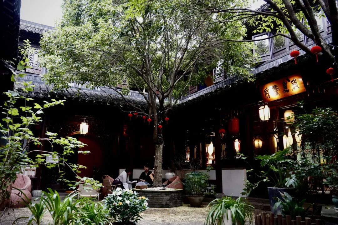 四周,古朴的屋檐错落有致,宛如一幅淡雅的水墨画,将现代的喧嚣隔绝于外。树下,人们悠闲地品着茶、吃点心,谈笑风生间,桂花随风轻舞,偶尔落在肩头,带来一丝丝清甜与惊喜。