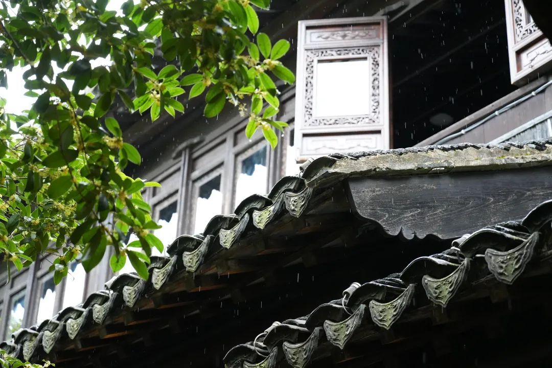 继续往前走,名士居庭院的两棵桂花树亭亭如盖,枝叶交织成翠绿的穹顶,细雨如丝,轻轻拂过每一片叶尖,为庭院增加了动人的气息。