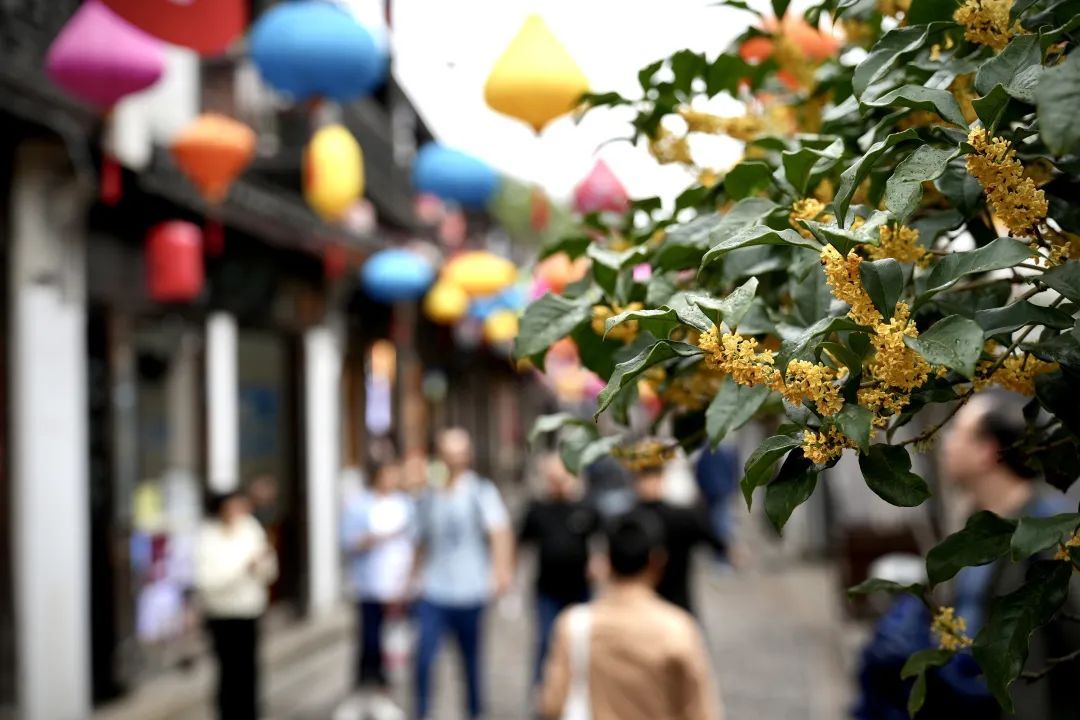 告别云翔寺的庄严,漫步至南翔老街,空气中弥漫着更加浓郁的桂花香,它们与沿街挂起的各式灯笼交织在一起,光影斑驳,如梦似幻。