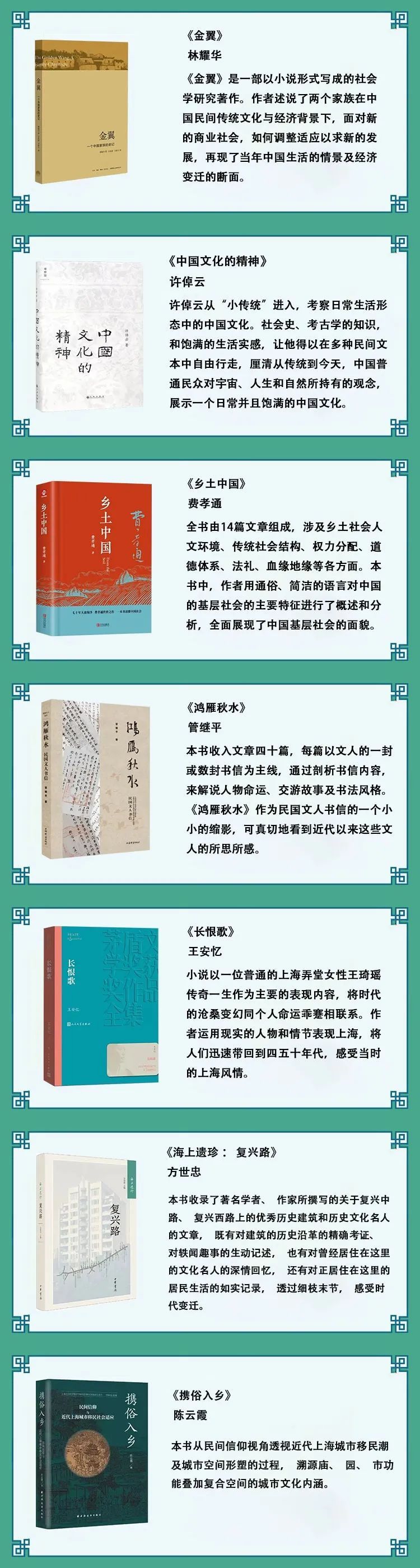 翻阅本期书单,《金翼》讲述传统文化在经济背景下的融合与变迁;从《中国文化的精神》中,看到日常且饱满的中国生活与文化实感;《乡土中国》在人文环境与传统社会结构中展示着中国社会面貌;从《鸿雁秋水》看到人们的所思所感,解读不同的人文风采;《长恨歌》将读者带回到四五十年代的海派风情;《海上遗珍:复兴路》多角度呈现上海建筑和人文的发展变化;《携俗入乡》透视近代上海城市移民潮及城市空间形塑的过程。