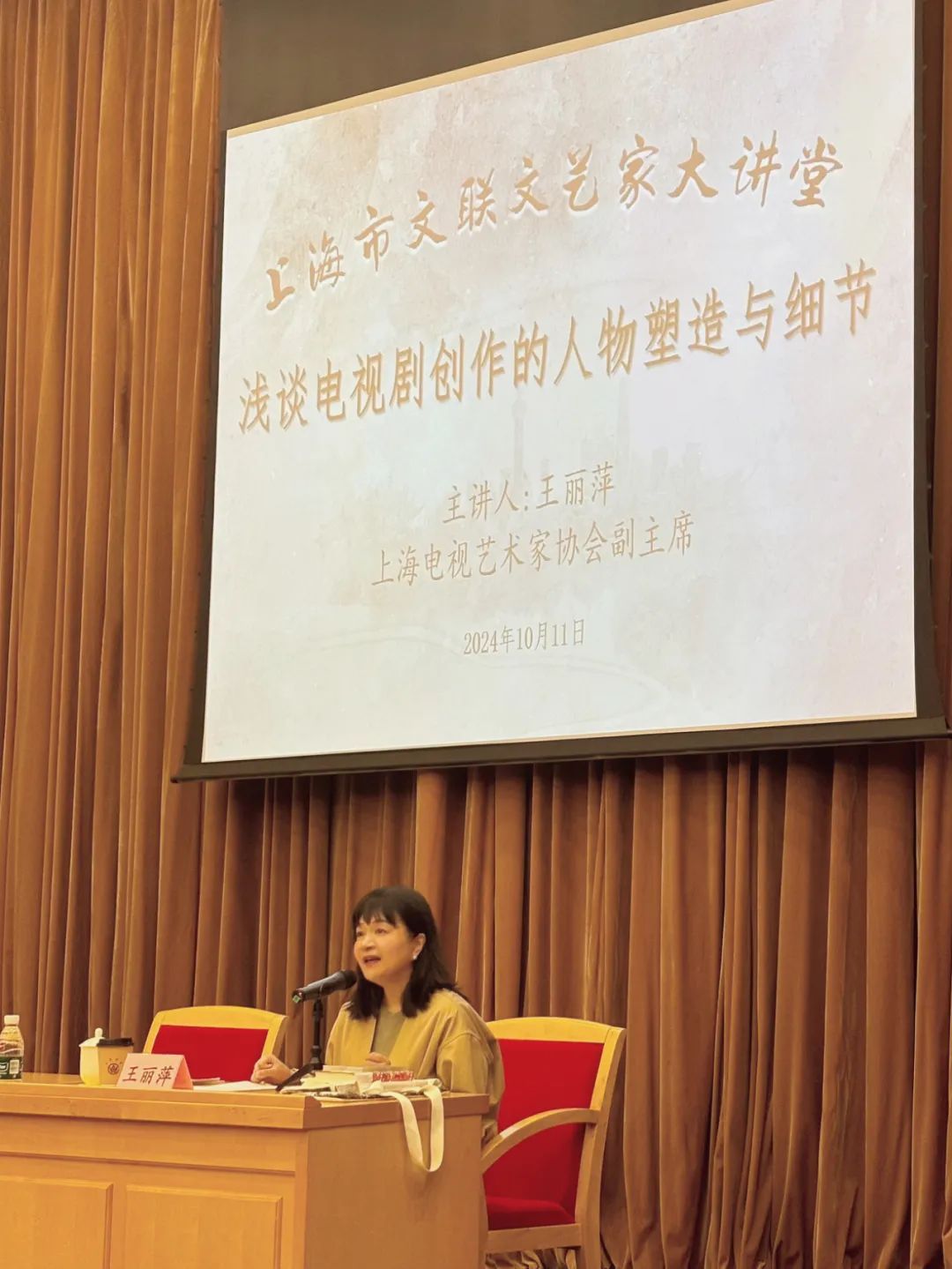 王丽萍说自己创作电视剧,事先功课一定要做足。思考与构思会占据很久的时间,会做充分的案头工作。她说要给人物写很清晰的人物小传。人物的前史、现今、过去、当下,都要明白发生了什么。在讲课时,王丽萍给大家设定了一个“剧本练习”,故事发生在“上海咖啡馆”里,请现场的观众即兴创作。现场有四位观众给出了完全不同的人物设计和故事走向。其中一个观众将人物设计为一个70岁的老人跟一个5岁的孩子,王丽萍说,这样的设置是很有空间的,我们可能想象,他们是爷爷、孙女?抑或是邻居?他们在咖啡馆干什么呢?他们出生在哪里?如果老先生是上海男人,会有一些人物特点,那他们的性格又是怎么样的?王丽萍说,当你把人物关系建立起来的时候,必须思考很多的东西,年龄、性格、语言,等等。一旦把他们的人物关系建立以后,你设置的前题与备注,在你以后的写作中,都能融合进去。