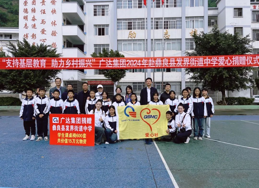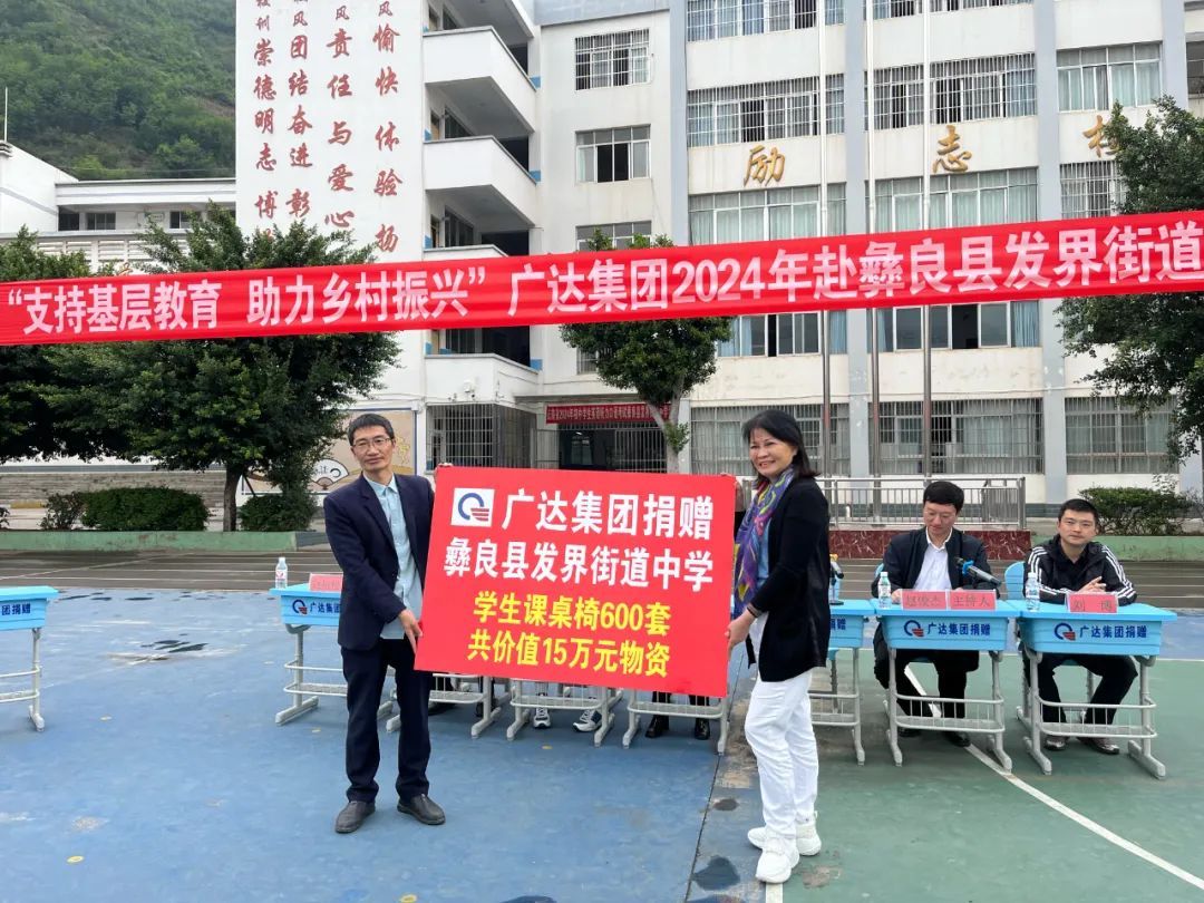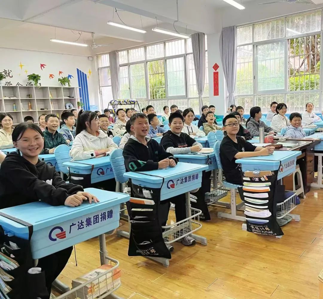 捐赠仪式上,广达集团爱心代表温秀琴女士向发界街道中学捐赠价值15万元的600套学生课桌椅,希望孩子们有更好的学习条件,鼓励他们努力学习、奋发向上、勇敢前行,怀揣梦想去创造属于自己的精彩人生。