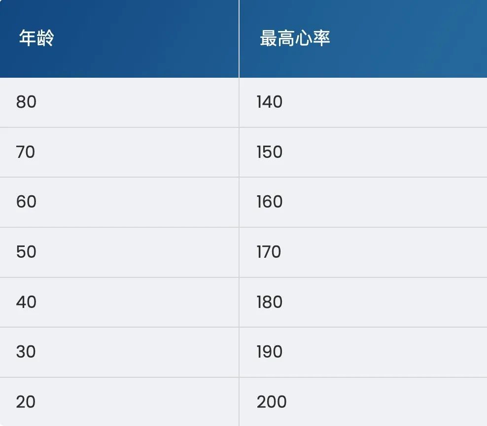 首先我们应该知道自己的最大心率,即指一个人在最大强度运动时能达到的最高心跳次数。常用的计算公式是:220-年龄。例如,一个30岁的人,其最大心率大约是190次/分钟。