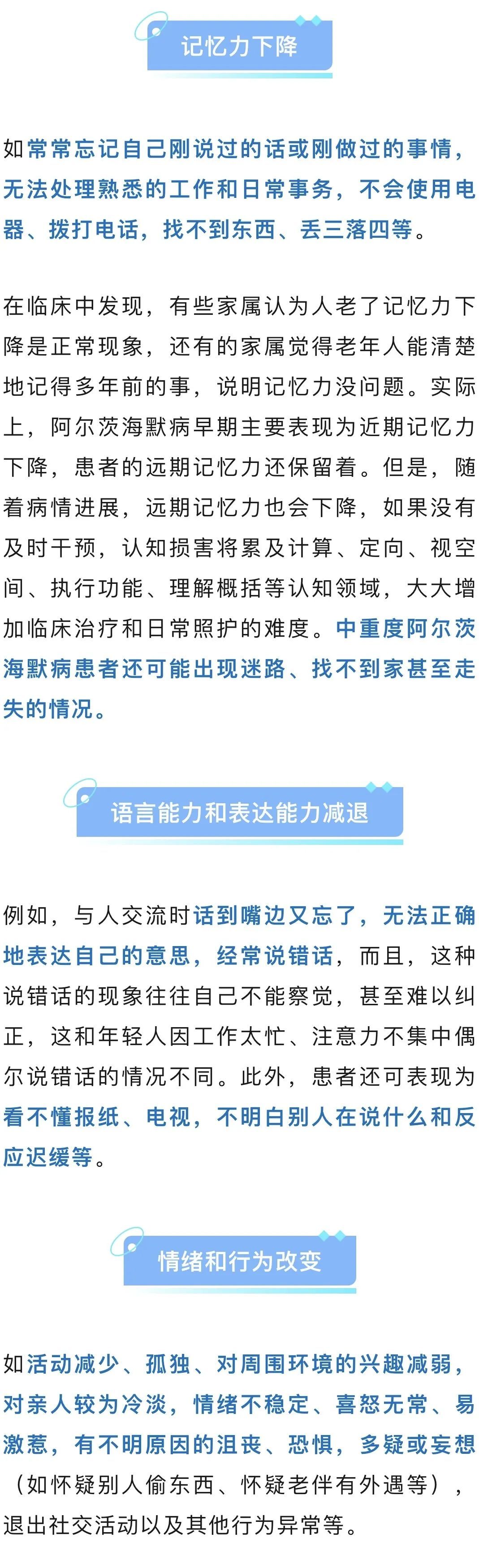 阿尔茨海默病(AD)是一种神经退行性疾病,临床特征主要包括认知障碍、精神行为异常和社会生活功能减退。阿尔茨海默病起病隐匿,现有的医疗技术尚无法治愈。所幸,阿尔茨海默病有一个发展过程,如果我们能及早发现蛛丝马迹,通过早筛早诊把握治疗时机,积极干预,就可以有效延缓疾病进展,让患者在患病后的很长一段时间内,仍能维持较好的生活质量。如果出现以下情况,应引起注意↓