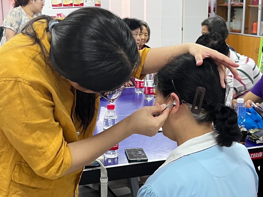 当天,专业医师早早抵达活动现场,为老人们提供服务。这已是该项目举办的第四场活动,基于前期收集到的居民需求,此次活动特别增设了贴耳穴服务。专业医师不仅进行了实际操作演示,还讲解了耳穴治疗的基本原理及相关知识。