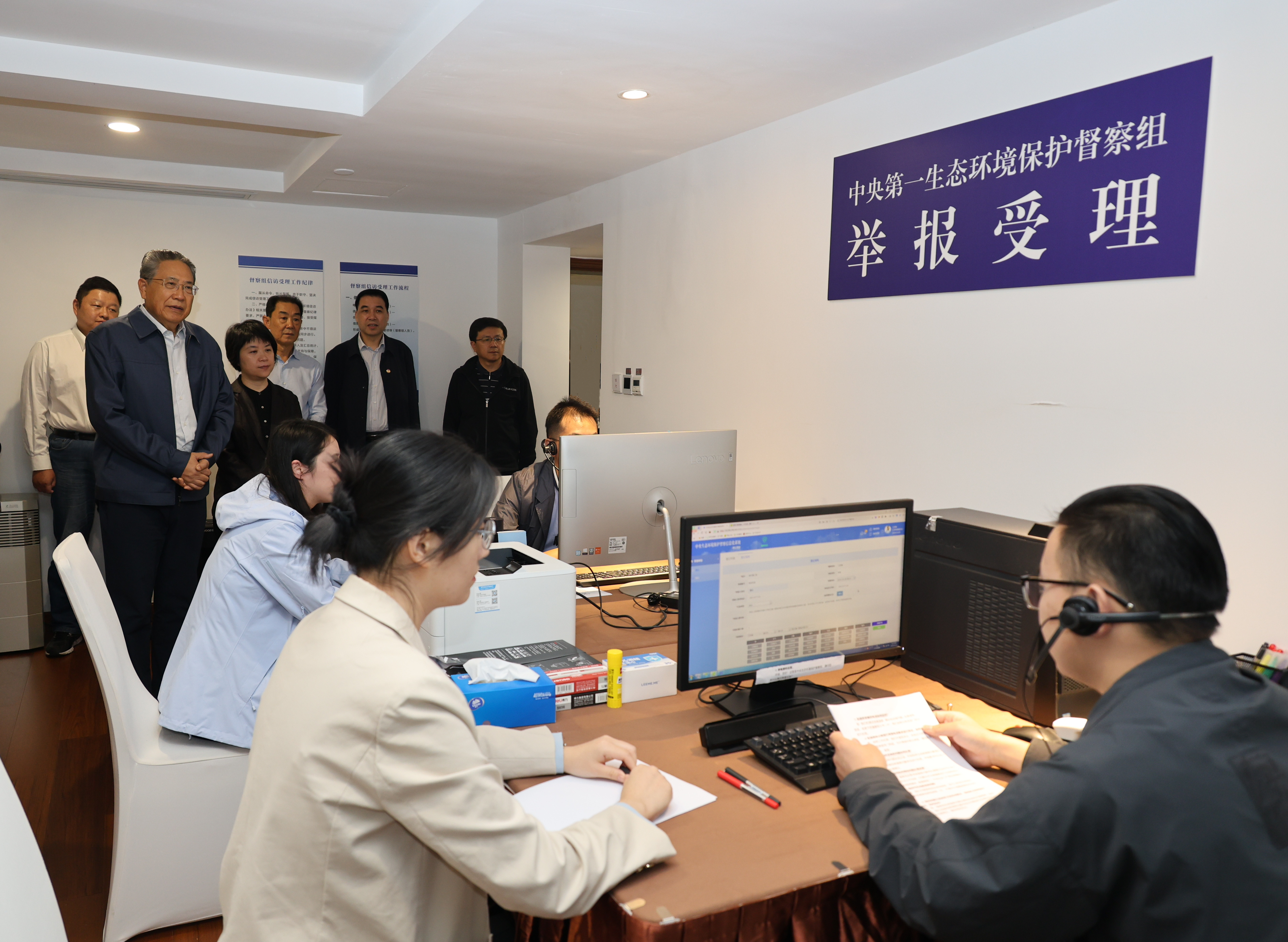 交汇点讯 10月20日上午,中央第一生态环境保护督察组组长李锦斌深入督察信访受理工作场所,调研群众来电来信受理转办工作,看望慰问工作人员,了解举报受理情况。他指出,信访工作是倾听群众对环境问题意见的重要窗口,也是发现基层环境问题线索的重要渠道,更是解决群众身边突出环境问题的重要平台,要充分发挥其功能作用,注意分析研判,及时精准受理转办,能解决的问题要及时按规定和程序抓紧解决,以切实增强群众的生态环境幸福感、获得感、安全感。他强调,要把群众需求放在信访工作首位,工作人员要耐心细致负责、热诚为民服务。督察组副组长郭芳、总协调人张迅,江苏省政府副秘书长徐华勤等参加调研。