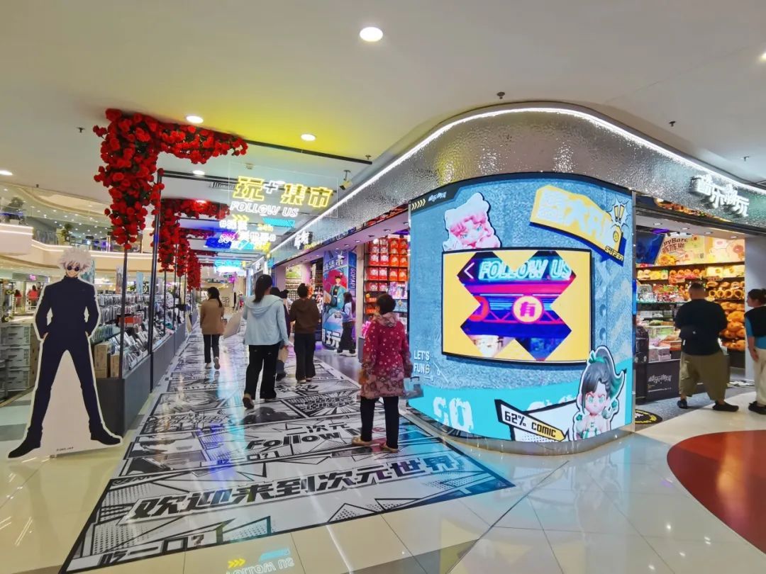 除了商场主导的大型升级外,随品牌入驻而焕新的小型升级也颇具看点。例如,国内潮玩头部品牌酷乐潮玩,新店位于龙之梦3层,店内集聚潮玩、文具、好物,以及多样的国内外IP。门店未来感的设计风格延伸至楼层通道,营造了一处特别的“玩+集市”,犹如一脚踏进了“次元世界”。