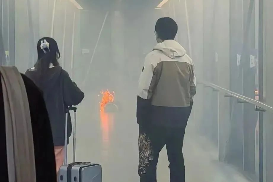 10月20日下午,在上海虹桥机场T2航站楼,一进港航班下客时廊桥内突然起火,疑似一名乘客使用充电宝时发生了自燃。