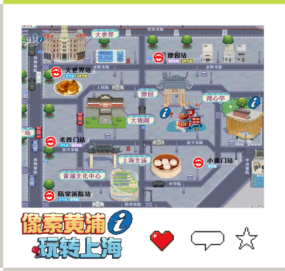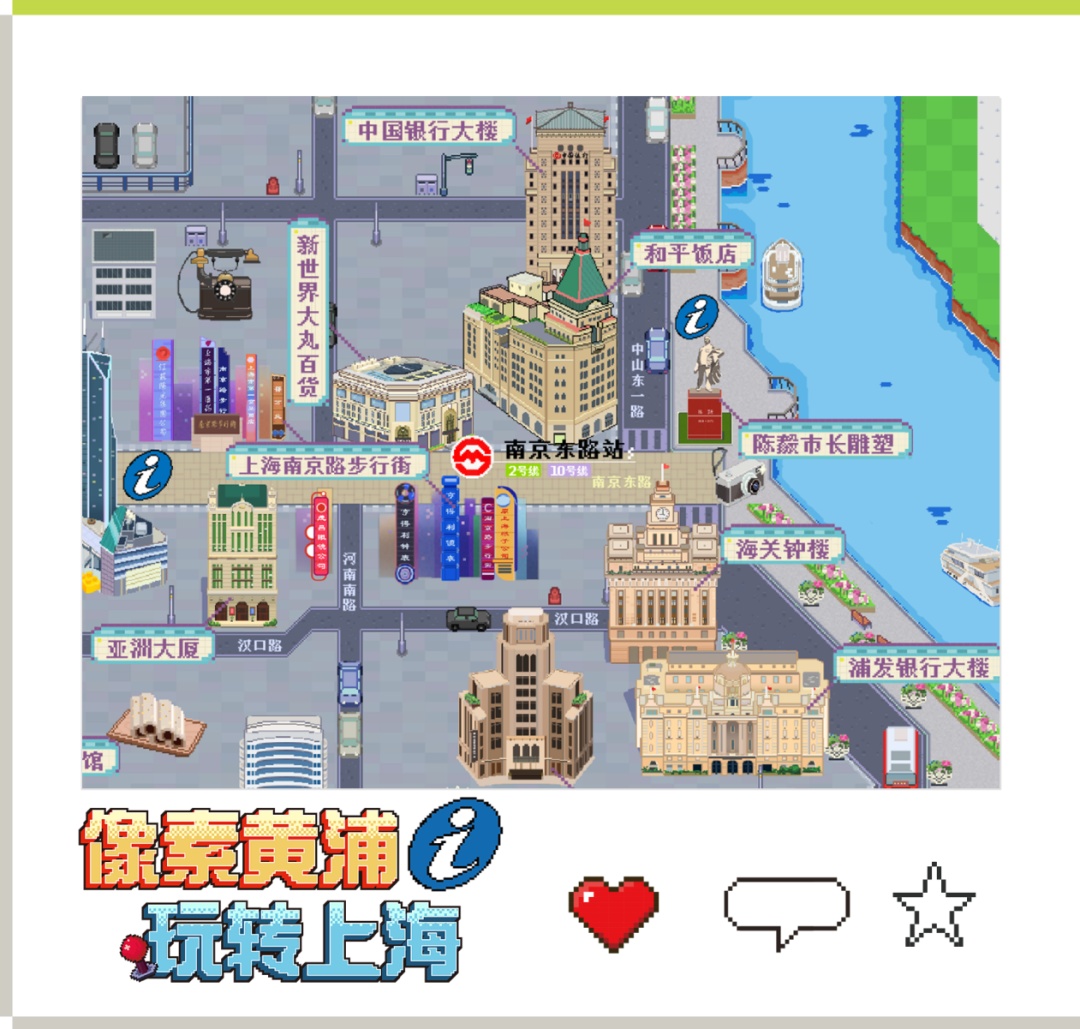 不管你是90后还是00后,这种充满回忆感的像素画风,直接把人带回了小时候玩像素游戏的时光,又给黄浦区的现代景色增添了独特的怀旧味道。不少小伙伴表示,“打开地图那一刻,感觉自己像是打开了童年通关的游戏关卡!有内味了!”