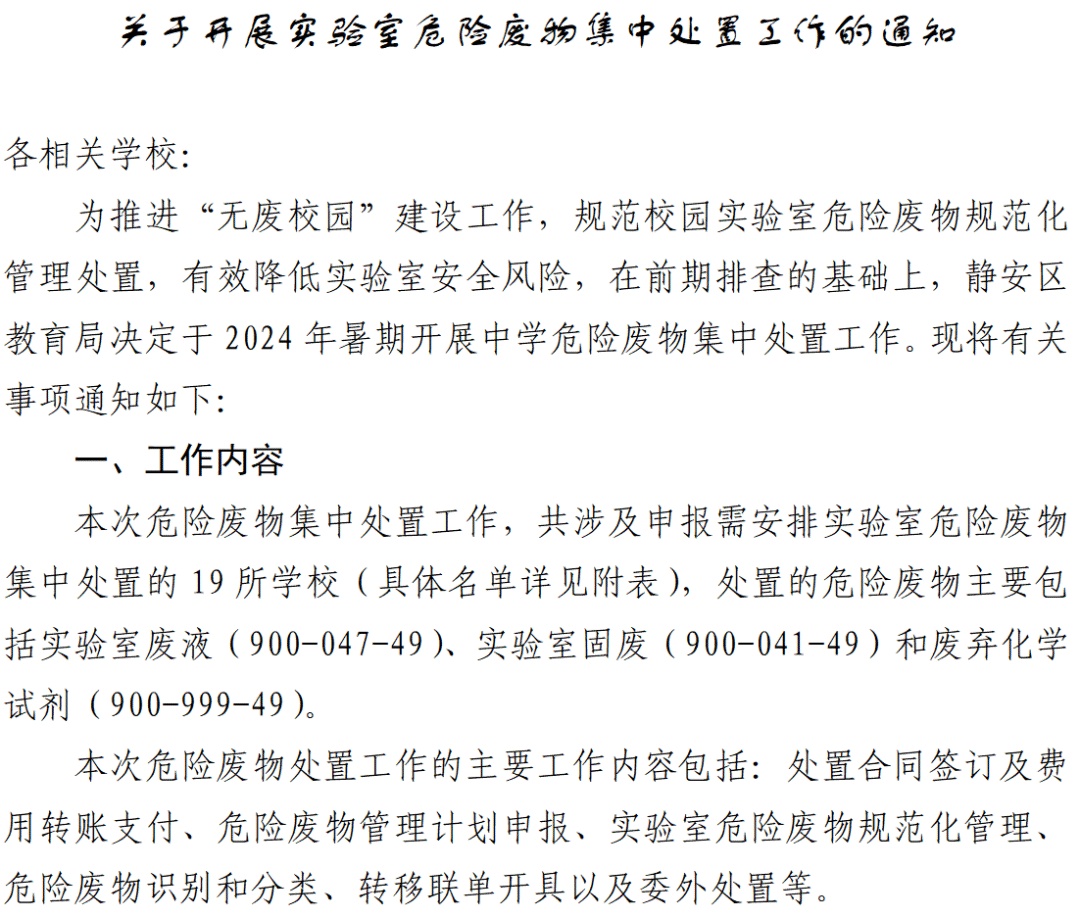 根据前期排摸情况,区教育局印发《关于开展实验室危险废物集中处置工作的通知》,并会同区生态环境局召开全区中学危险废物处置推进会。