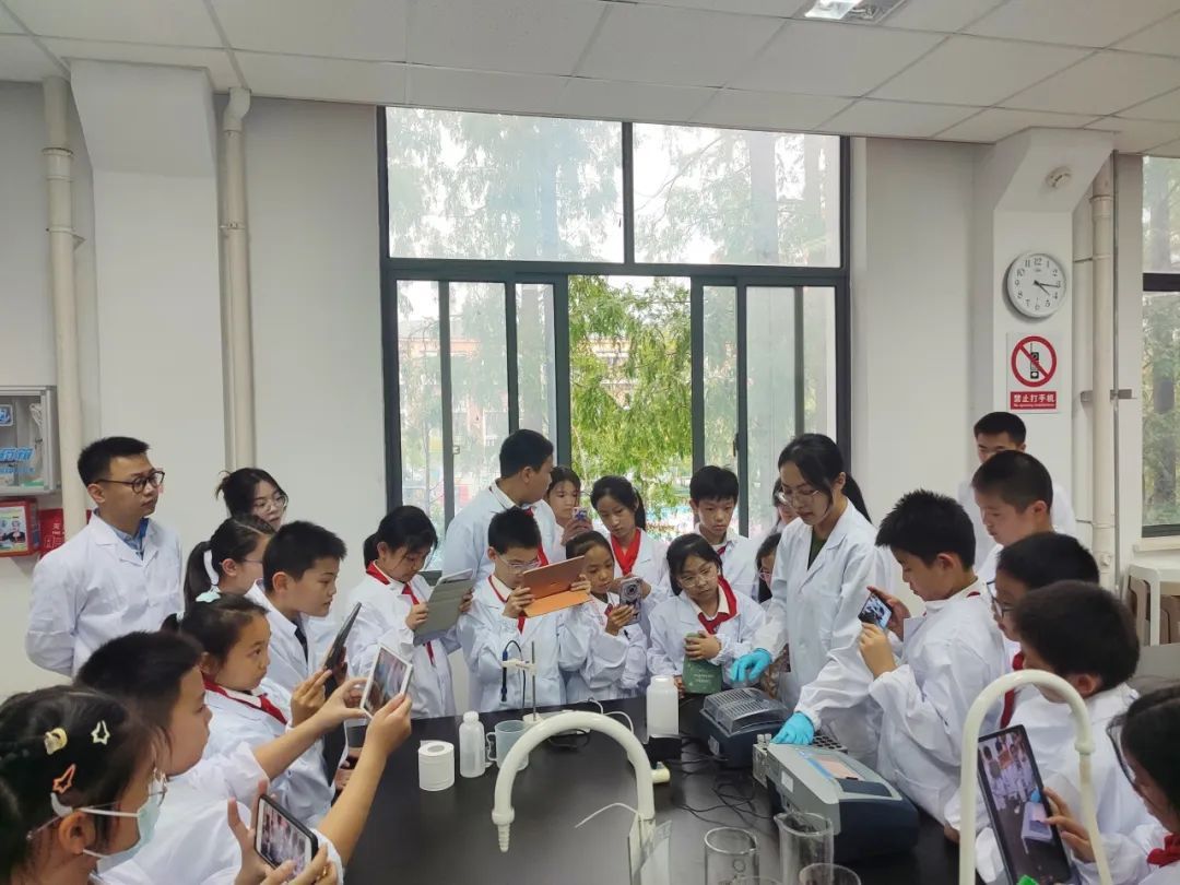 怀揣着好奇与向往,孩子们走进了大学校门。华东理工大学资源与环境工程学院专业指导丁老师向大家详细讲解水样采集及测水质的实验室规范操作方法,并重点讲述了污水变清流的奥秘等,孩子们身穿实验服,认真听讲和记录。