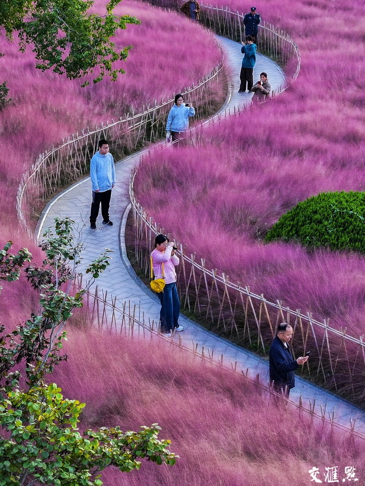 10月20日,徐州大龙湖南岸的粉黛乱子草演绎秋日最美丽的童话,市民们相约邂逅粉色浪漫。高刚 摄