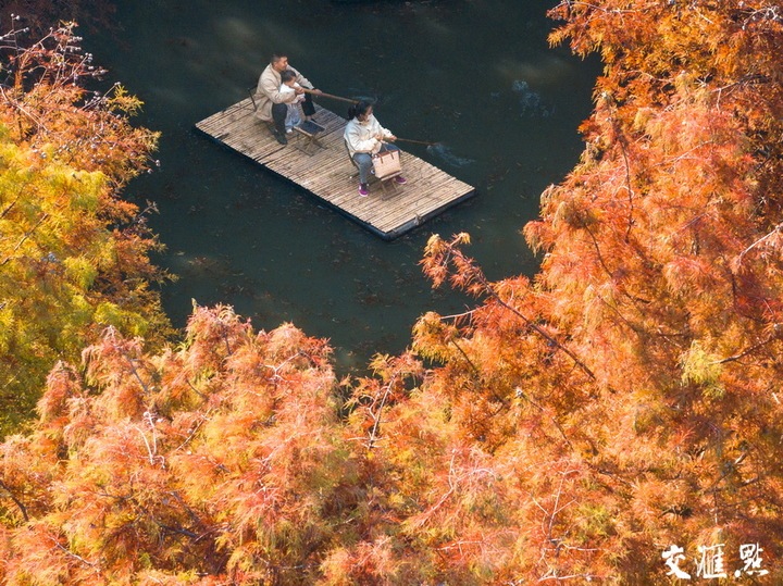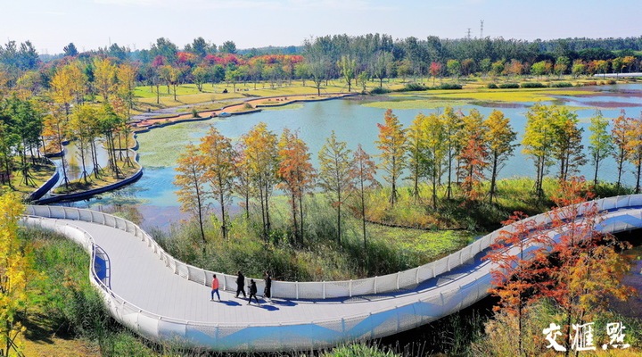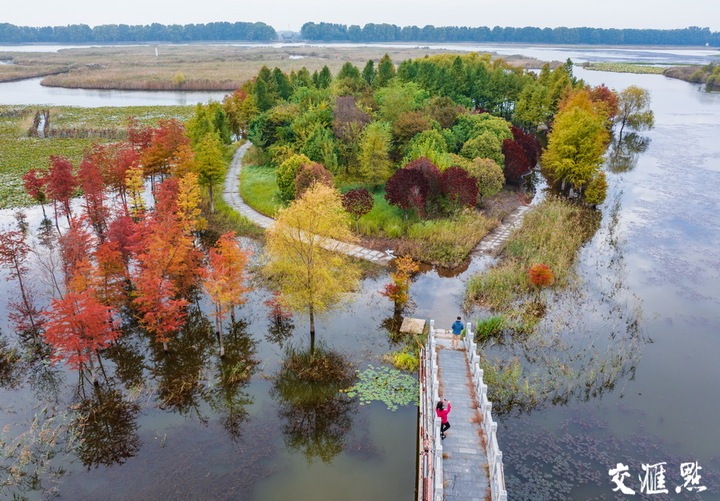 10月20日,泗阳县龙窝潭生态缓冲区层林尽染、色彩斑斓,吸引市民来此休闲游玩。郑明高 摄