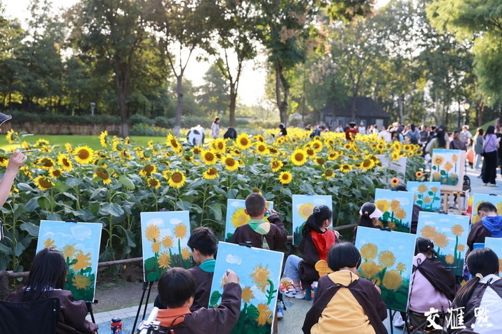 10月20日,南京绿博园荷兰园内向日葵盛放,吸引不少孩子前来写生。柏滨丰摄