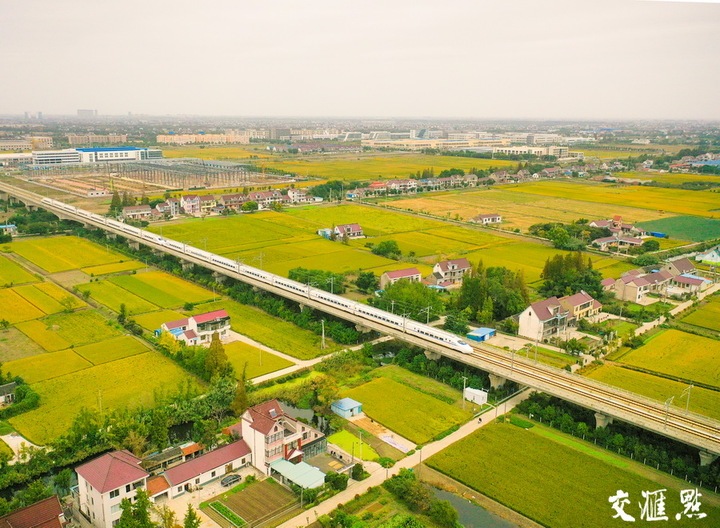 10月20日,在如皋市城南街道马塘社区境内,飞驰的动车组列车在金黄色的稻田穿行,乡景如画。徐慧 摄