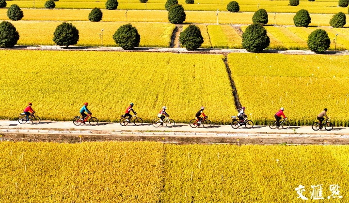10月20日,泗洪县石集乡稻米小镇,自行车运动爱好者在金黄色的稻田里骑行,乐享田园好时光。李佳 摄