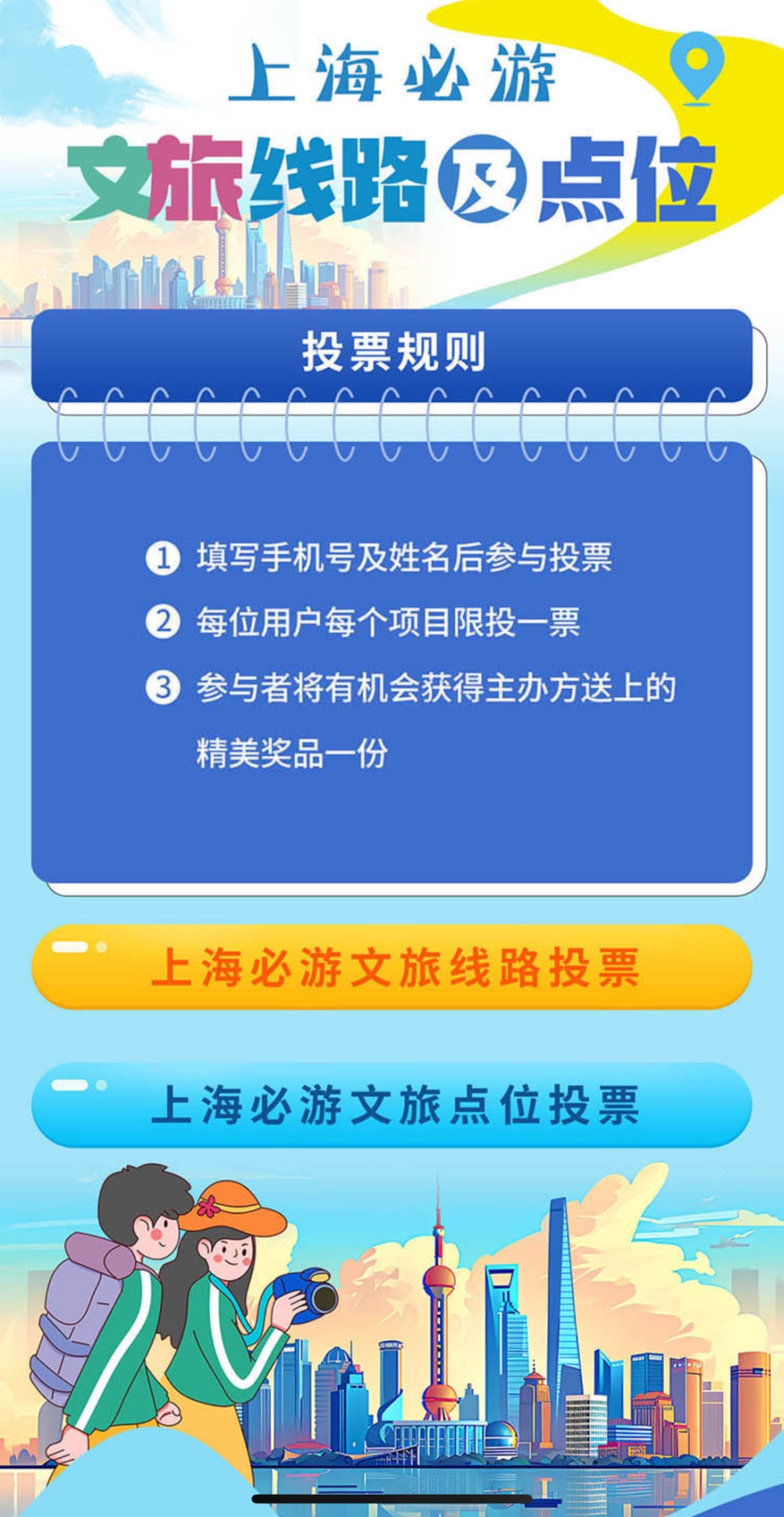 2.点击“我要投票”,再点击“上海必游文旅线路投票”和“上海必游文旅点位投票”,进入投票通道。