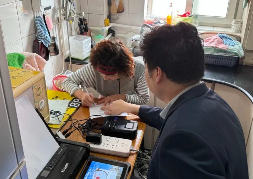 吴阿姨家住6楼,考虑到高龄老人上下楼梯多有不便,中心与社区工作人员提前约定时间,通过智能手持平板电脑一体机、便携式打印机等远程受理设备,提供“升级版”上门帮办服务。