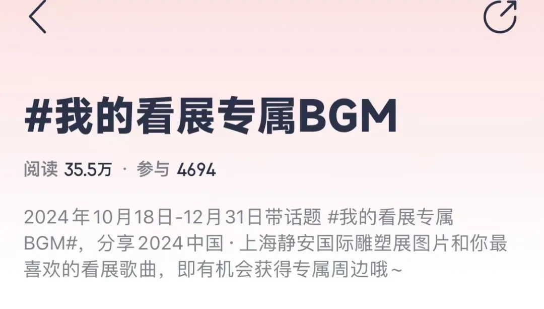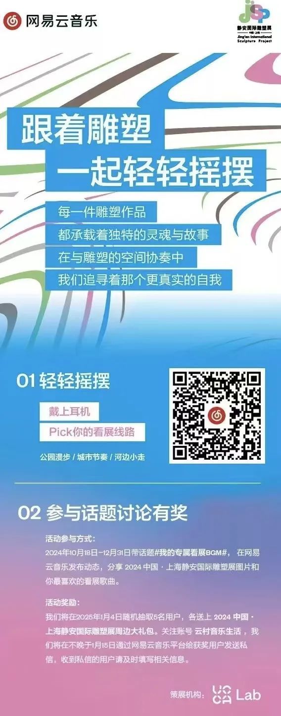 即日起至12月31日,观众参观游览2024静安国际雕塑展的同时,可在网易云平台带话题#我的看展专属BGM#,分享静安雕塑展图片和你最喜欢的看展歌曲,平台方将在2025年1月4日随机抽取5名用户,各送上静安雕塑展周边大礼包。关注账号云村音乐生活,将在不晚于2025年1月15日给获奖用户发送私信,收到私信的用户请及时填写相关信息。