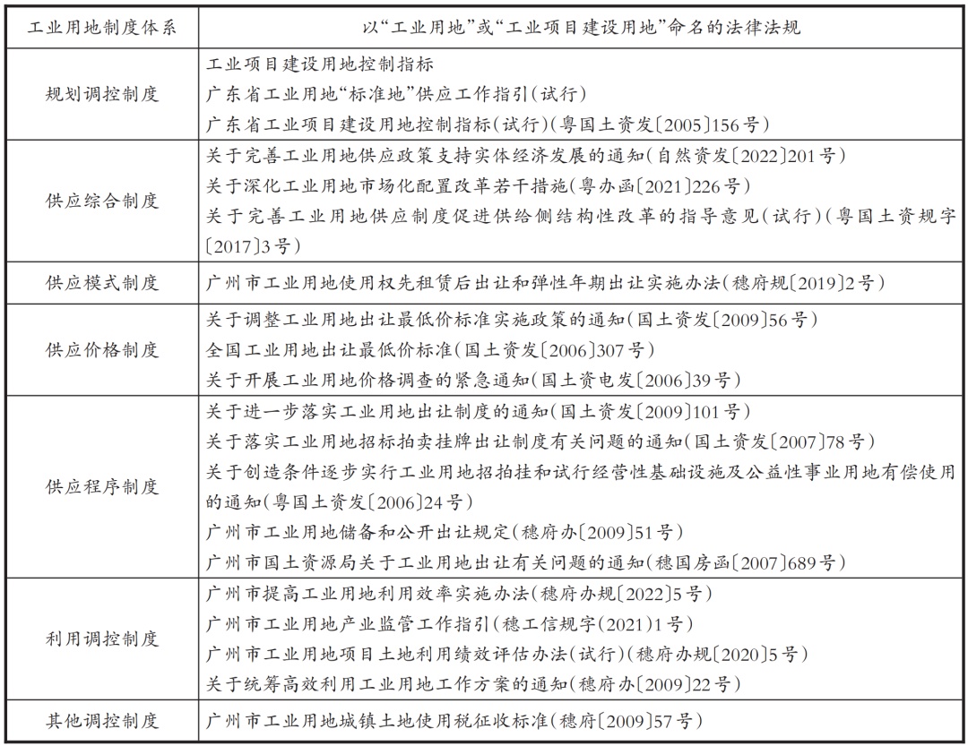 中共中央、国务院《关于构建更加完善的要素市场化配置体制机制的意见》指出要推动土地要素市场化配置……深化产业用地市场化配置改革。《中华人民共和国国民经济和社会发展第十四个五年规划和2035年远景目标纲要》更指出要推动工业用地提容增效,推广新型产业用地模式。工业用地作为企业生产和经营的基础要素之一,如何建构以及优化其制度将影响企业经济发展乃至营商环境进程。工业用地制度是理论问题更是热点实践问题,为此本文选择分析、提炼和总结粤港澳大湾区的法治经验。无论是定性或定量分析,工业用地这一要素在粤港澳大湾区的产业发展中的作为抓手的重要性不言而喻。定量分析上,根据威科先行法律信息库,以“工业用地”检索(仅标题)相关省级法律法规的数量,发现福建省(111部)、浙江省(72部)、广东省(71部)位居前三,其中福建省的相关法律法规中约71%(79部)是由厦门市出台,若将此异常值剔除后分析可知工业用地制度对于广东等我国工业大省的战略地位。定性分析研究同样指出粤港澳大湾区是最积极探索工业用地制度完善的地区之一,本文所引地区为例,广东省陆续出台《广东省土地要素市场化配置改革行动方案》《关于深化工业用地市场化配置改革若干措施》以及《广东省工业用地“标准地”供应工作指引(试行)》等文件,包括深圳市、广州市等在内的地级市也不断尝试“新型产业用地”“工业上楼”等创新实践。工业用地法律散见于各类文件、规定中,而工业用地制度法治化的基础之一是若干制度的体系化,制度体系化一般又可以根据内容分为外部体系和内部体系。工业用地制度的外部体系是相较于土地管理的一般规范和非工业用地的特别规范。相比土地管理的一般规范,以规划用途作为划分依据进行专业化规制,决定工业用地制度的法域定位是更偏向宏观调控规范,而非民商事或市场管理规范,宏观调控规范的规制性特点对于工业用地制度的深入理解适用尤为关键,后文将展开论述。相比非工业用地(比如商住用地等)的特别规范,以工业用途进行专业化管理,决定工业用地制度具有特殊的内部体系。结合理论和实践,工业用地制度的(内部)体系可以分为:规划调控制度、供应调控制度(包括综合、模式、价格、程序等)、利用调控制度和其他调控制度四个部分(以下简称“工业用地法律体系”),前三个制度分别对应过程中的事前、事中、事后。以演绎法研究工业用地法律体系是指从一般土地管理的规范体系中提炼工业用地法律体系。工业用地的基础法律是土地管理法,该法第4条第1款指出“国家实行土地用途管制制度。”。另外还有《中华人民共和国土地管理法实施条例》(以下简称“《实施条例》”)、《节约集约利用土地规定》等主要土地管理规范。上述三部法律法规的框架可以提供工业用地制度体系借鉴吸收(见表1),其中三点值得注意:第一,我国基于计划经济的路径依赖,法律、行政法规和部门规章对于规划调控和供应调控制度的内容基本完备,其中更是将耕地保护规划单独成章,体现我国土地管理有重准入轻过程的历史调控特点。第二,我国法律和行政法规缺乏有关利用调控制度的章节,仅仅少数条款和部门规章提及,其中《节约集约利用土地规定》第六章的规定较为笼统,仍有待下位法完善,这一特点符合我国立法和实践趋势。第三,尽管工业用地制度以宏观调控法律为主但是仍有部门民商事或市场管理法律,例如土地管理法第二章涉及权属等规制制度基础。总的来说,本文所提工业用地法律体系同一般土地管理规范体系相适应。工业用地制度多散见于各法律法规并呈现地方法律法规的数量大幅地多于中央的现象,以归纳方法将这些工业用地特别规范分类,也能论证本文所提工业用地法律体系的科学性。以“工业用地”或“工业项目建设用地”命名的法律法规(包括规范性文件,见表1):国级共有7部,分别是规划调控制度1部、供应综合制度1部、供应程序制度2部、供应价格制度3部;省级(以广东省为例)共有5部,分别是规划调控制度2部、供应综合制度2部、供应程序制度1部;市级(以广州市为例)共有8部,分别是供应模式制度1部、供应程序制度2部、利用调控制度4部、其他调控制度1部。内容提及“工业用地”或“工业项目建设用地”但非以其命名的中央法律法规(不包括规范性文件):法律、司法解释对工业用地未作出特别规范,行政法规仅《中华人民共和国城镇国有土地使用权出让和转让暂行条例》对工业用地作出五十年土地使用权出让最高年限规定,部门规章(不包括部门其他文件)中《节约集约利用土地规定》提及6次(涉及规划调控的第15条和第26条、涉及供应模式的第23条、涉及供应价格的第24条和第37条)、《招标拍卖挂牌出让国有建设用地使用权规定》提及1次(涉及供应程序)。总的来说,本文所提工业用地法律体系同各现有特殊工业用地规范相适应。表2 以“工业用地”或“工业项目建设用地”命名的法律法规