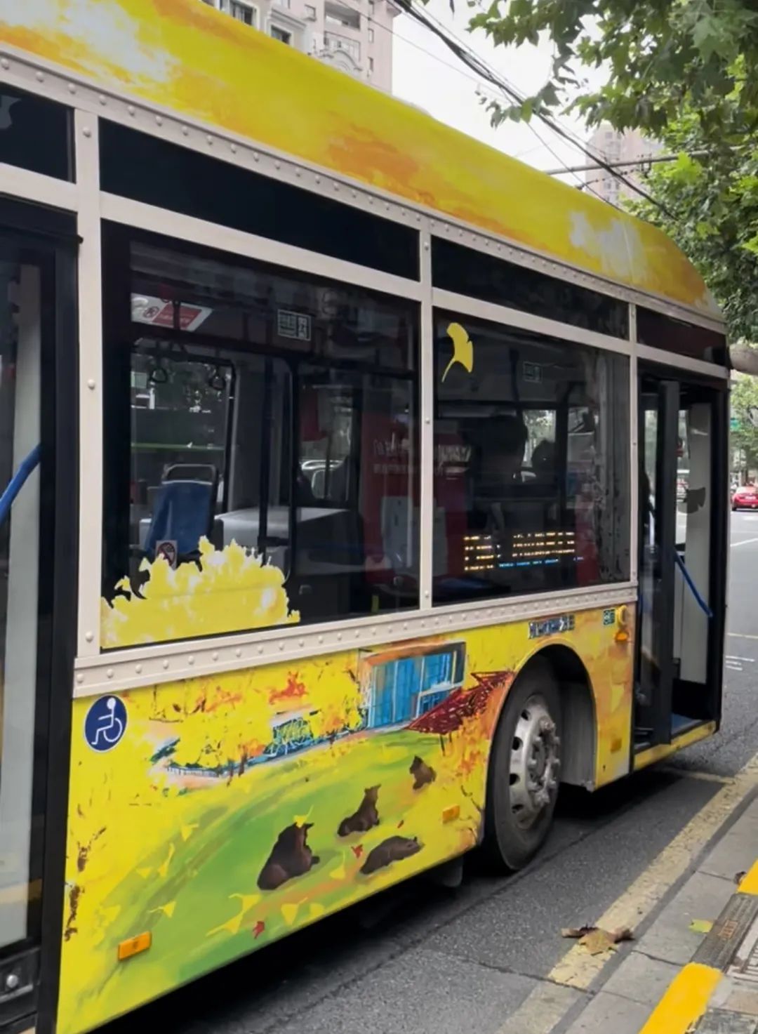 在新闸路石门二路公交车站,静宝偶遇了这辆“秋日巴士”,金黄色的车身与周围的车流形成了鲜明的对比,为上海近期连绵的阴雨天带来一抹愉悦的亮色。