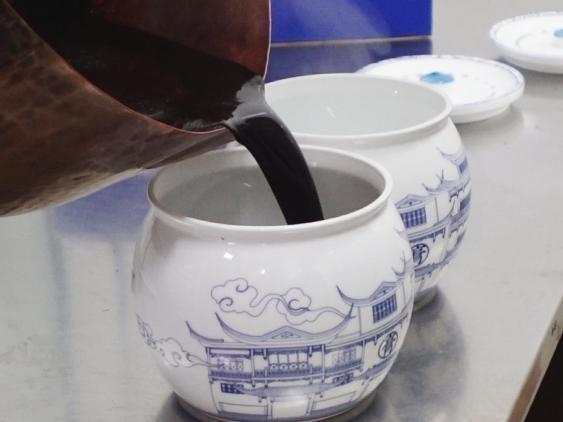 童涵春堂的制膏工艺传承两百余年,“费时费力”、精益求精:精选的道地药材先经12小时充分浸渍,再经3道提取、4次浓缩,然后以武火煎煮,最后文火收汁成膏,今天,这一“浸、煎、滤、收”的古法工序已逐渐被机械化取代,但童涵春堂仍旧坚持“一人一方一铜锅”的纯手工操作,每副膏方所用的药材、熬膏的火候、收膏搅拌的圈数,全凭丰富经验的老师傅的手眼功夫、拿捏分寸;传统紫铜锅的使用,避免了高温下与药物发生反应,再以冬竹做铲,施力更均匀,保证膏体更细腻、更好吸收。