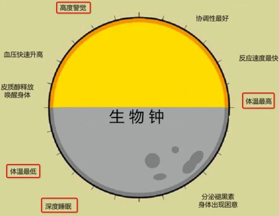 人类的生物钟主要是以24小时为周期的昼夜节律,昼夜节律系统调控着我们的睡眠、觉醒、体温、饮食、新陈代谢、能量水平、免疫系统等生命活动。比如说我们普通人的睡眠都是晚上睡觉,白天醒来,这是睡眠-觉醒节律控制的;体温一般是早晨较低,白天逐渐升高,这是体温节律控制的。