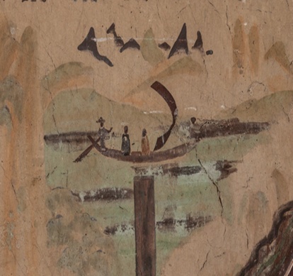这幅壁画描述了三国时期的高僧康僧会在江南弘教的故事情节,图中康僧会乘坐鼓帆摇橹小舟,顺风而行下江南。反映了摇橹置帆的舟船已被广泛应用于当时人们的生活之中。