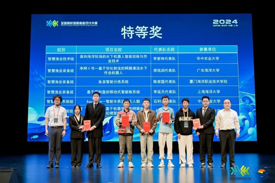 经过激烈的角逐,华中农业大学的“面向海洋牧场的水下机器人智能巡检与作业技术”、广东海洋大学的“净网Ⅱ号—基于空化射流的网箱清洁水下作业机器人”、厦门海洋职业技术学院的“鱼苗智能分拣系统”、上海海洋大学的“基于饵料盘的移动式智能检测系统”、中国农业大学的“AquaEdge—智能水质监测无人船”和青岛农业大学的“智‘渔’有道—基于机器学习的网箱鱼类精准投喂策略研究”等6件作品获得特等奖。