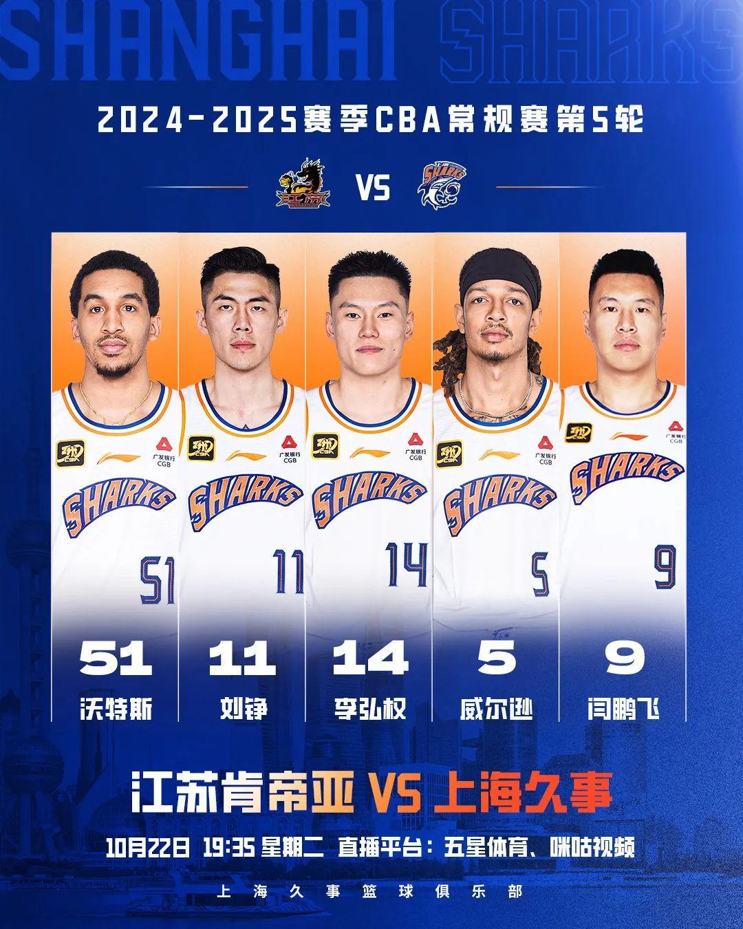 本场比赛前,两队均遭遇开赛四连败,这也意味着今晚将有一支球队会取得赛季首胜。大鲨鱼中锋王哲林因伤缺阵,老将闫鹏飞顶替他首发,其他四人为刘铮、李弘权和双外援沃特斯、威尔逊。