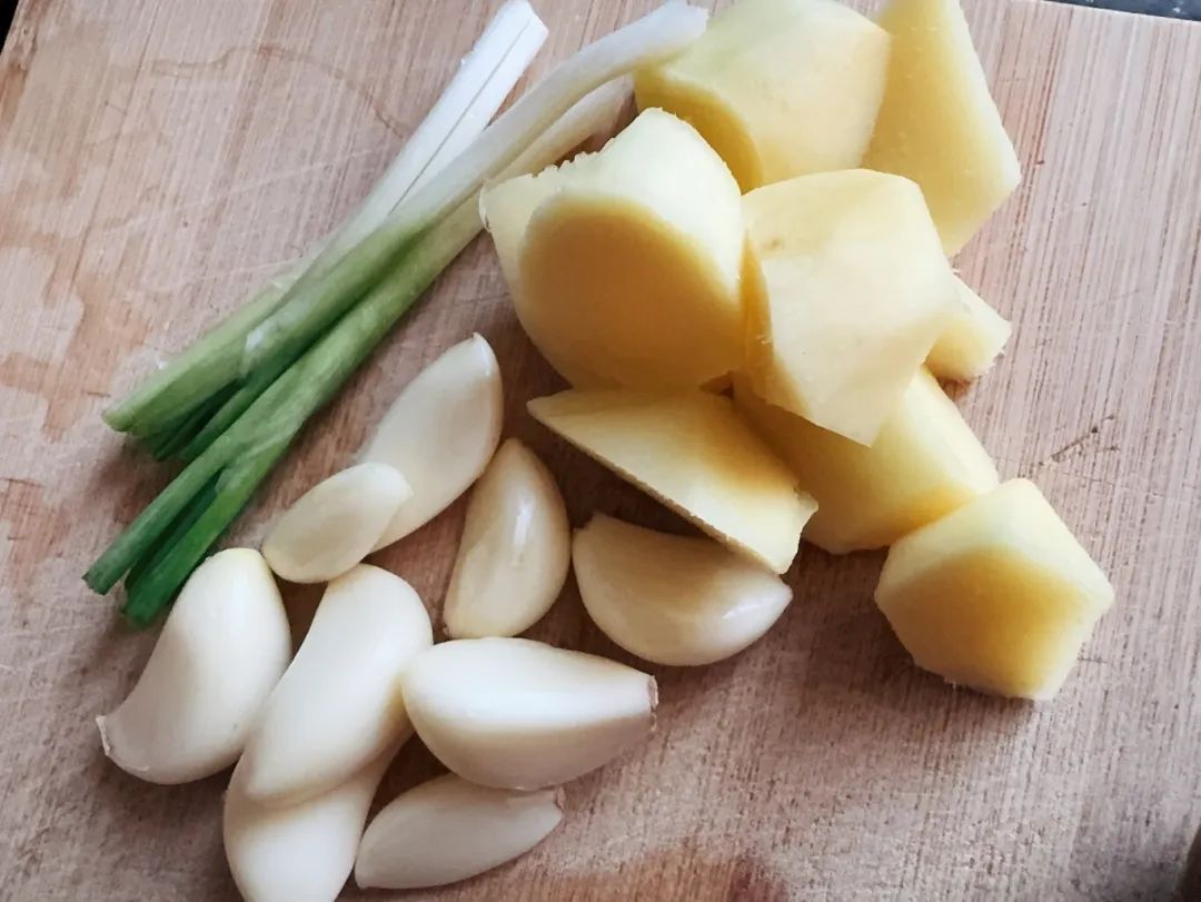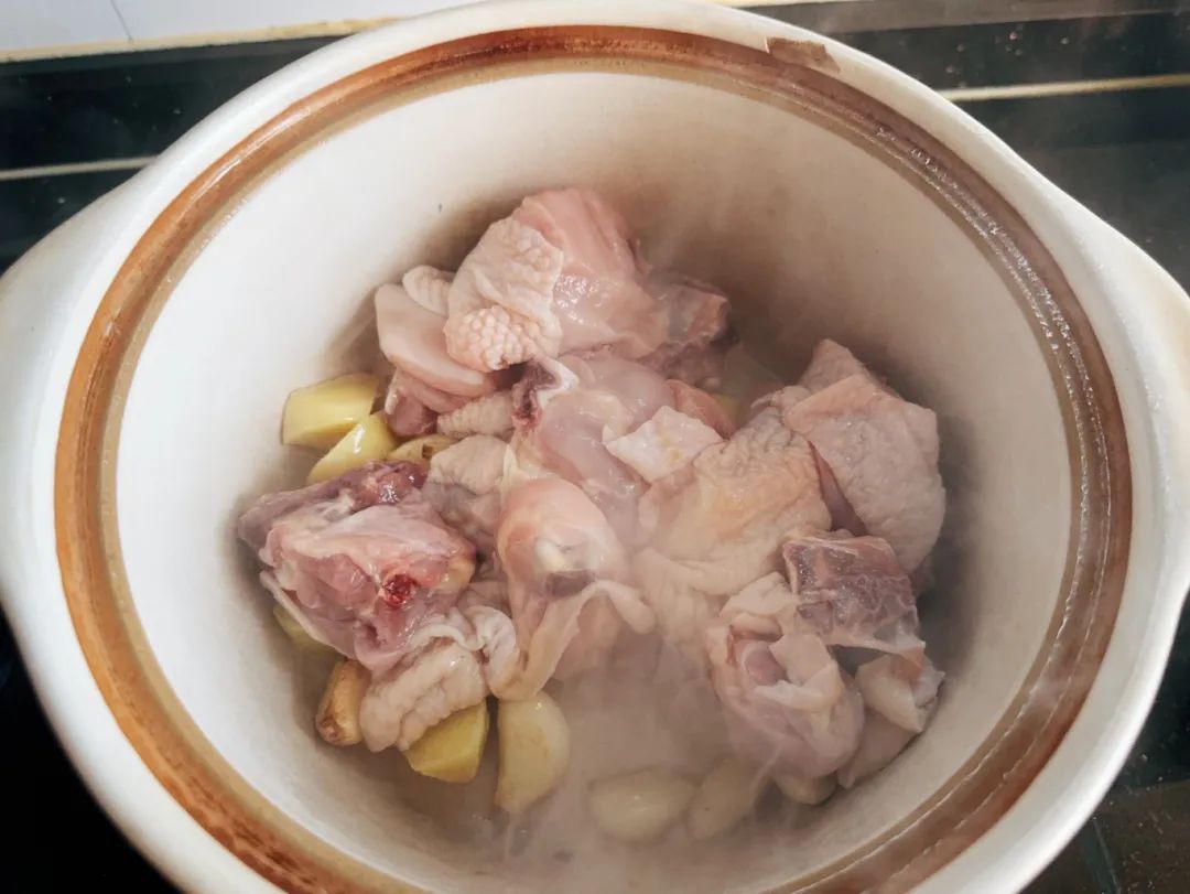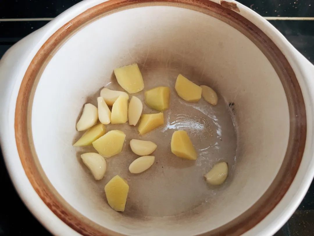 2.热锅倒油,再倒入大蒜、姜块翻炒出香味。