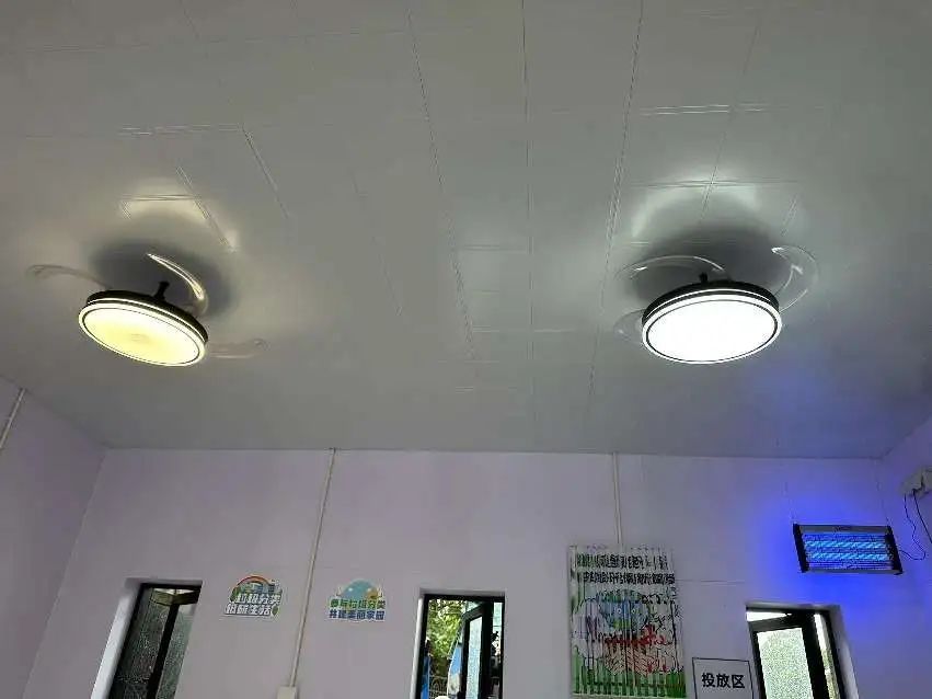 全新升级的垃圾箱房将原本露天的大面积场地增设顶棚,加装铝扣板吊顶,拆除老旧设备更替为新型吊扇灯,重新布线,更新排风设备,增设除臭设备、紫外线灭蚊灯,换装太阳能照明系统,更节能更环保。