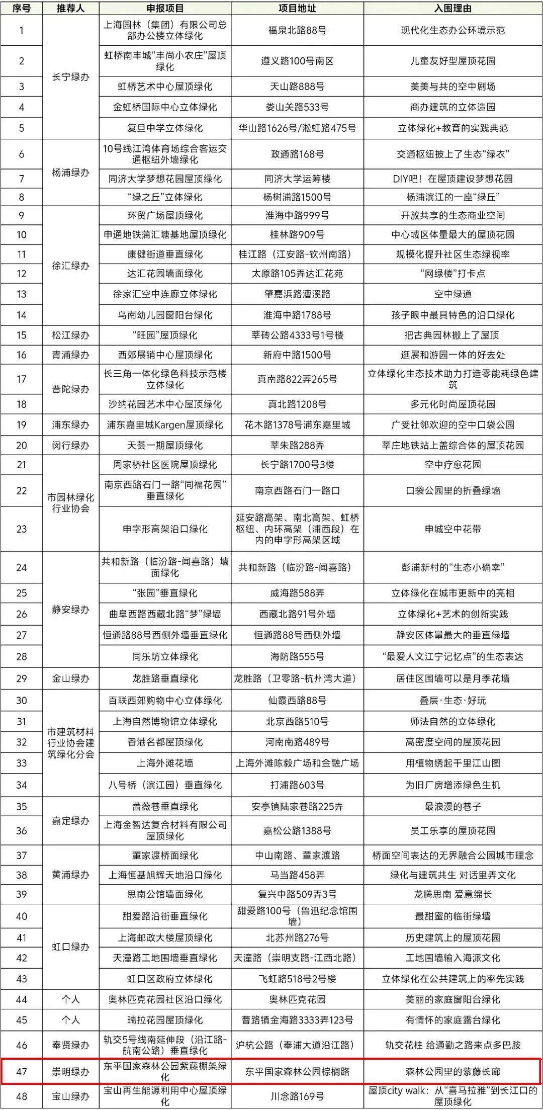 为进一步总结、分享和传播上海立体绿化实践成果,深化立体绿化社会参与机制,凝聚广大社会力量共建共治、共谋发展,本市绿化部门于3月启动了2024上海“我眼中的立体绿化”优秀案例征集传播活动。 主办方收到了来自全市16个区、园林绿化行业协会、建筑材料行业协会、个人等申报的立体绿化案例近150个。经专家组评审,对申报材料进行审核,项目实地走访,本市共有48个立体绿化项目获得优秀案例入围资格,其中崇明东平国家森林公园的紫藤棚架绿化项目入围! 棚架绿化(崇明) 屋顶绿化 垂直绿化 沿口绿化 2024上海“我眼中的立体绿化”优秀案例入围名单 (排序不分先后) 来源:绿色上海 编辑:陆海华
