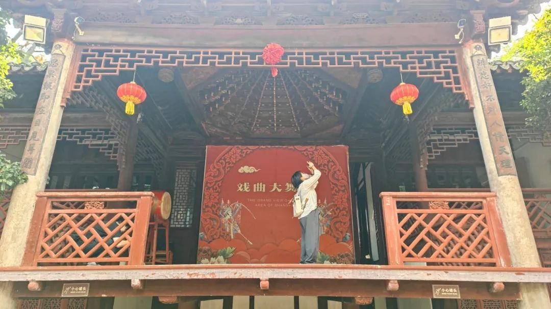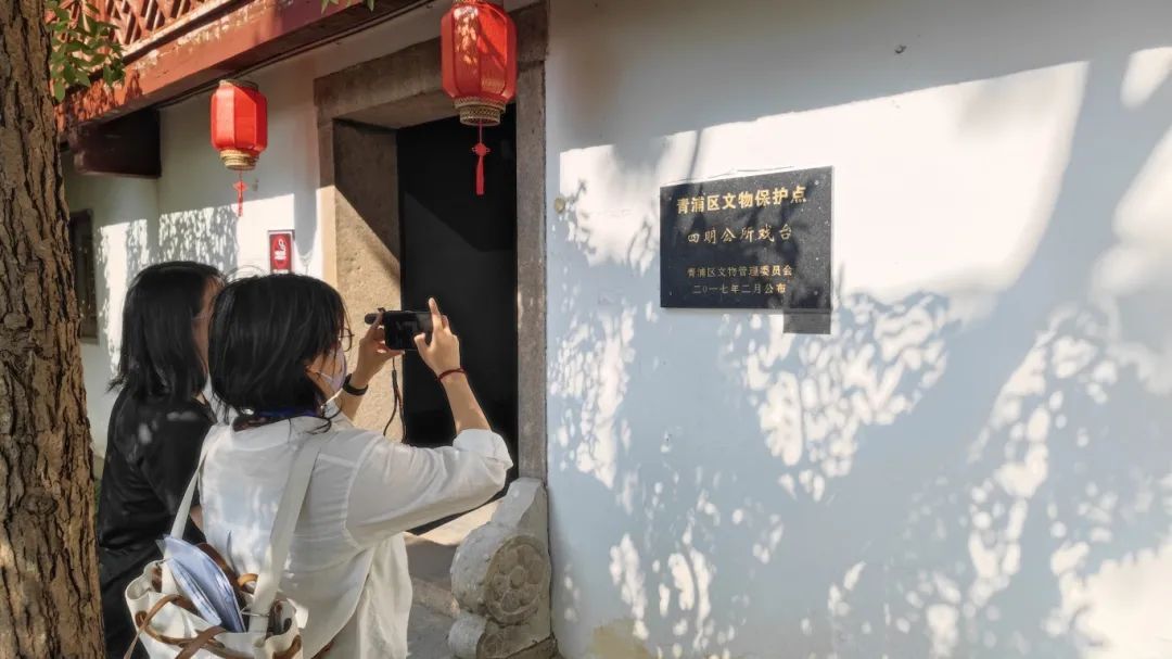 上海大观园戏台的前身是四明公所戏台,原位于上海市黄浦区四明公所内。该戏台建于清嘉庆二年,为二层建筑,台高约有1.8米、宽约7米、深约7米,呈方形。1989年,四明公所戏台迁移至上海大观园,成为红楼梦主题景点之一,并于第三次全国文物普查时作为新增文物被登记在册。日前,青浦区第四次全国文物普查工作专班来到大观园,对包括四明公所戏台在内的7处现存文物的保护情况进行实地复核和调查评估。青浦区第四次全国文物普查工作专班成员、青浦区博物馆副馆长周金金说:“今天是我们第四次文物普查工作的实地调查。我们再次来到了这个‘三普’时的新发现建筑,进行实地调查,对它进行信息的复核,看看它和‘三普’时相比有什么变化,并且更新它所有的文物信息。因为我们在这期间做过一次维护保养,所以‘四普’也是在考察我们‘三普’以来这十几年文物保护利用工作做得怎么样。”