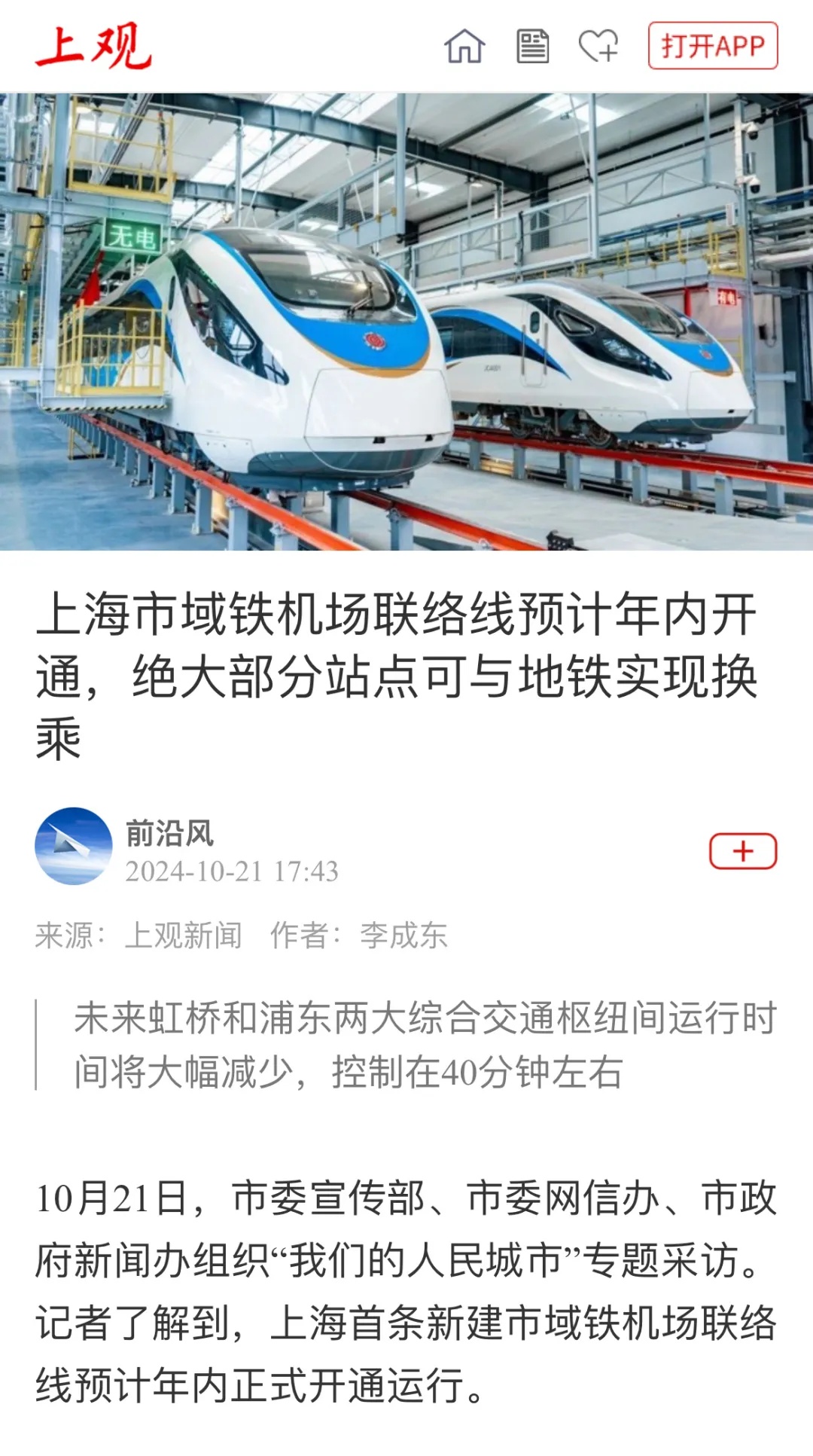 10月21日下午,20余家中央及上海本地媒体约30人齐聚建设冲刺中的市域铁机场联络线,聚焦建设调试、运营准备情况,通过实地参观、聆听讲解、沟通交流、现场采访等方式,多方位、小切口、行进式拍摄采访,用图文笔墨与镜头语言切身感受和传递“人民城市”理念在上海的生动实践。