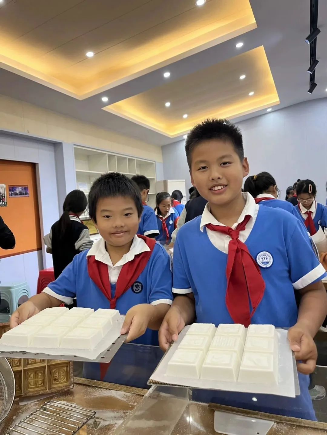 在金胜村万英生态农场,上海市农业劳动模范、上海源江农产品专业合作社社长沈万英带领学生们制作起了传统米糕。只见,“小小糕点师”先小心翼翼地将面粉倒入筛网中,轻轻抖动,接着轻轻按压抚平,每一步都仔细操作。沈万英还不时耐心提醒:“颠平的时候,拍打要均匀,不能太重,也不能太轻哦!” 不一会儿功夫,印有不同图案的米糕生胚便脱模成形了。“看起来挺简单,做起来并不容易。尤其是最后一步,上下翻转模具要又快又稳,千万不能手抖。”六(5)班学生施晨宇说。