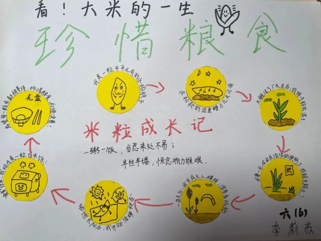 从稻谷到米糕,一粒米怎样才能长成呢?沈万英讲述的《一粒米的成长记》令同学们印象深刻。“从播种的那一刻起,一粒米就开始了它的奇妙旅程。肥沃的土壤、充足的阳光和水分,一样都不能少。” 六(6)班学生李蔚苏说,透过沈万英的讲述,除了了解大米生长的条件和过程,她对“谁知盘中餐,粒粒皆辛苦”有了更深入的理解。在当天的学习小报中,她这样写道:“一粥一饭,当思来处不易;半丝半缕,恒念物力维艰。”