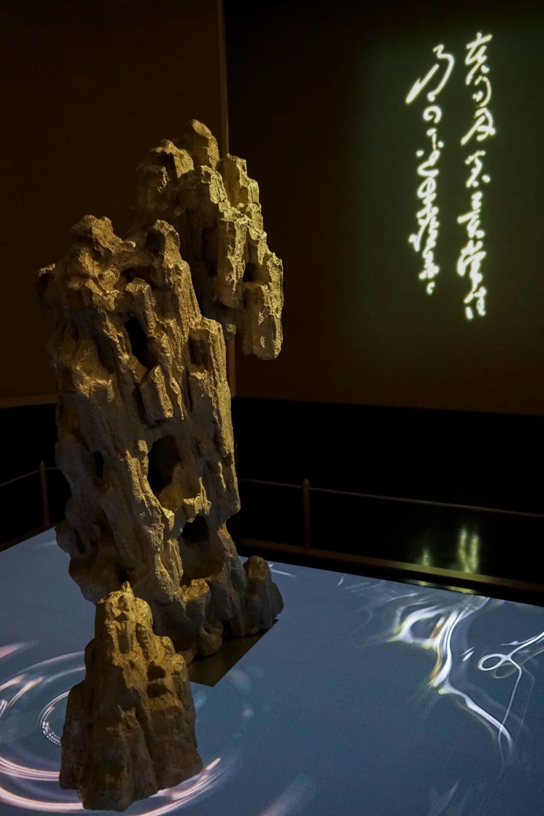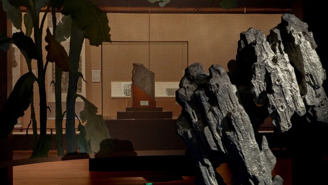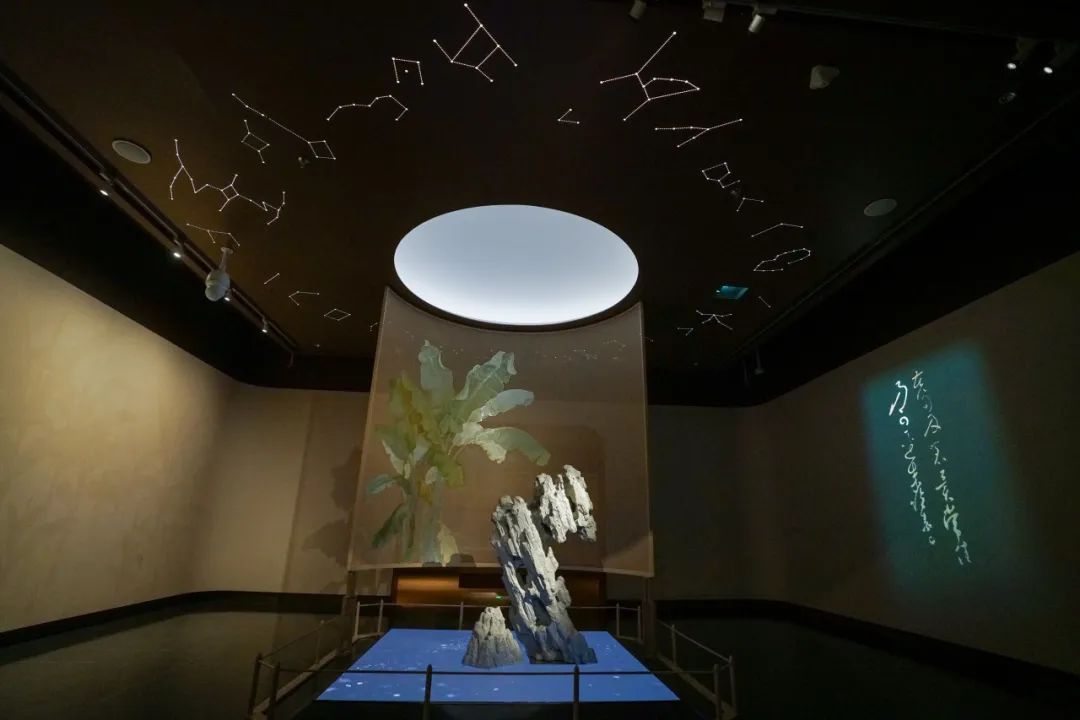 步入书法馆序厅,首先映入眼帘的便是充满诗意的种蕉厅,既是一个装置作品,又是帷幕隔断。其设计灵感来自唐代书法家怀素的传奇故事,相传怀素因无纸可用,便在芭蕉叶上挥毫创作。帷幕内外影影绰绰的“蕉石”出自唐孙位《高逸图》经典画意。展厅通过芭蕉树影、太湖石雕塑与LED屏幕营造独特意境,使得置身其中的观众瞬时沉浸于一种沉静的观展氛围,于自然与人文意境中体悟中国的翰墨丹青。