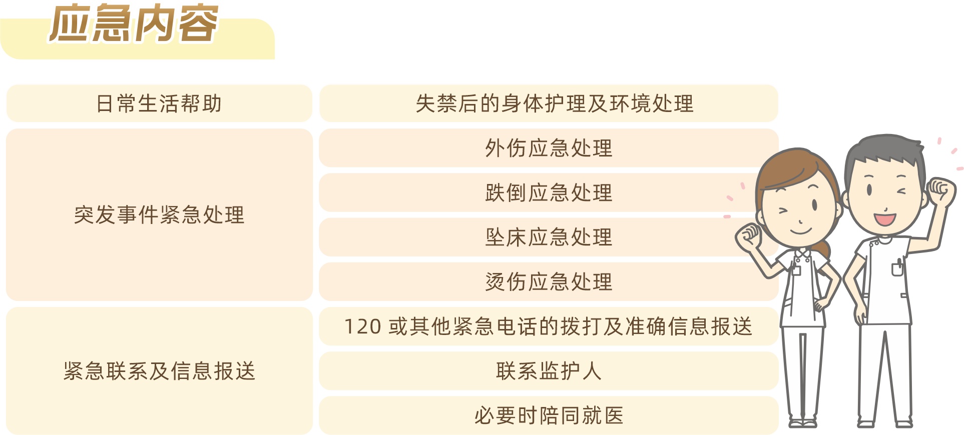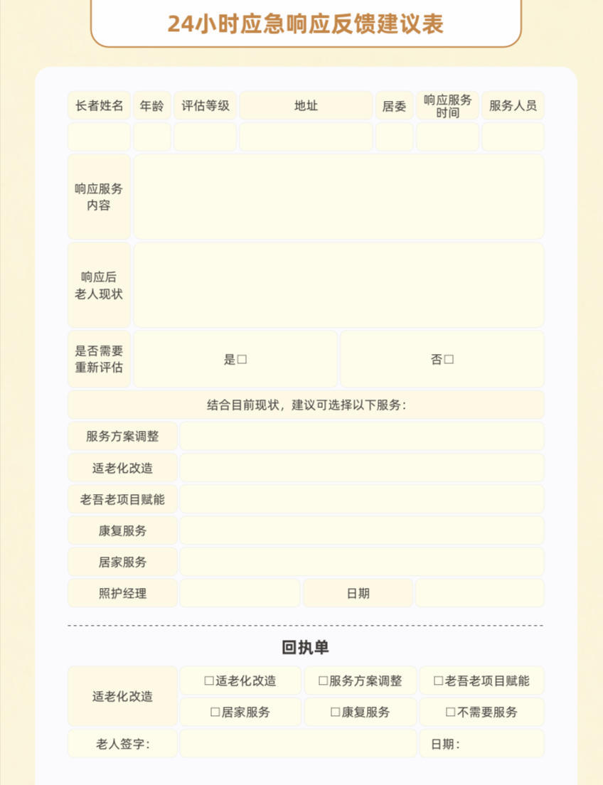 “3”即响应三类需求:日常生活帮助,主要针对失禁后的身体护理及环境处理;突发事件紧急处理,包括外伤应急处理、跌倒应急处理、坠床应急处理和烫伤应急处理;紧急联系及信息报送,提供120等紧急电话拨打及准确信息报送,帮助长者联系监护人,必要时陪同就医,多维度在事中响应老人突发需求。