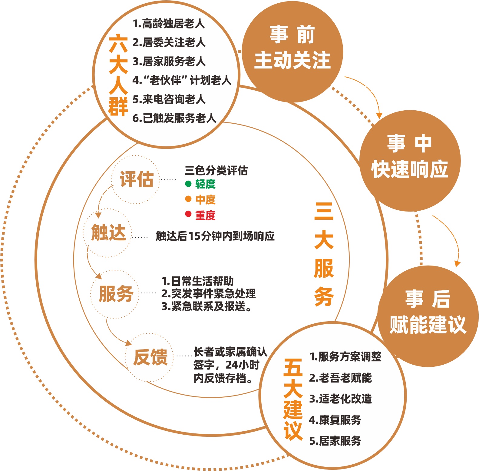 “6”即重点关注六类人群,包括高龄独居老人、居委关注老人、居家服务老人、“老伙伴”计划老人、来电咨询老人和已触发服务老人,通过分级评估、分类施策、分段干预的方式,在事前多渠道动态把控服务对象状态。