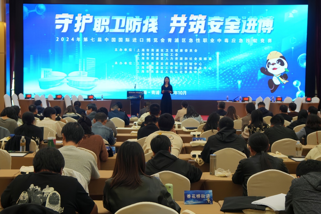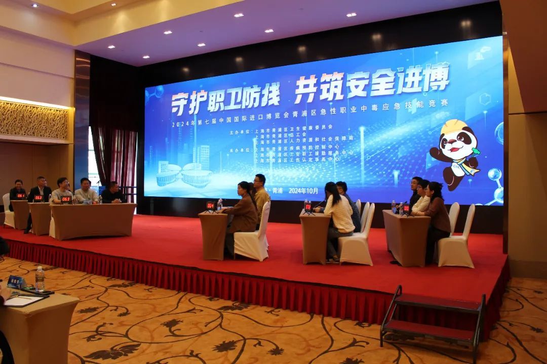 为进一步提升第七届中国国际进口博览会期间的职业病防控应急处置能力,昨天(10月23日)下午,区卫健委、区总工会、区人社局共同举办第七届中国国际进口博览会青浦区急性职业中毒应急技能竞赛。来自全区11个街镇的33名选手展开激烈角逐,全面检验、展示了青浦区职业病防控应急处置能力。