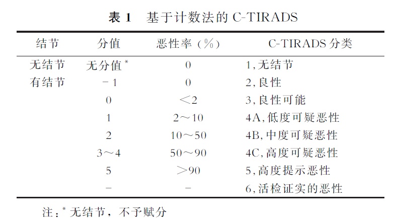 TI-RADS(Thyroid Imaging Reporting and Data System,TI-RADS)是甲状腺结节超声恶性危险分层指南,2020年中华医学会超声医学分会发表了适于中国国情和医疗状况的C-TIRADS (Chinese-TIRADS)指南,根据最终的分值得到结节的风险分层如下:
