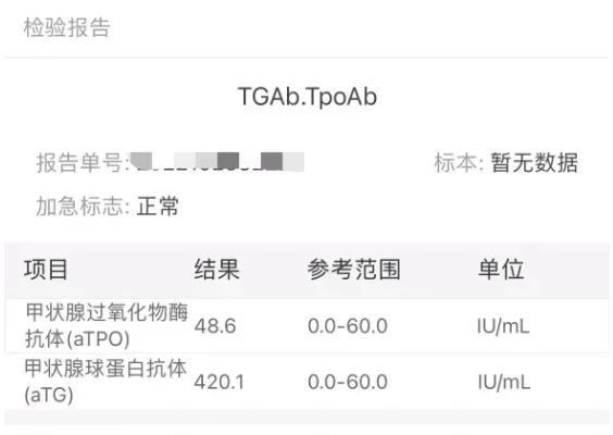 检验结果显示,小怡的甲状腺球蛋白抗体值高达420.1IU/mL,比参考范围的最高值高了7倍。